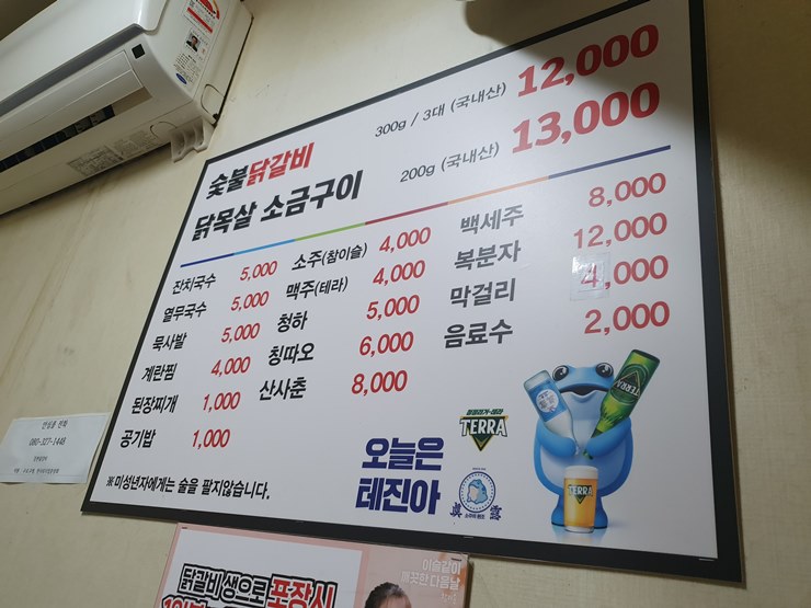 주문되어 있는 닭갈비를 보고, 숯이 들어오기 전 메뉴판을 찍어보았습니다.
