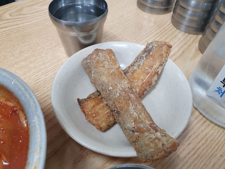 갈치튀김은 서비스로, 살이 많거나 조림의 갈치처럼 촉촉 탱탱하지는 않습니다.