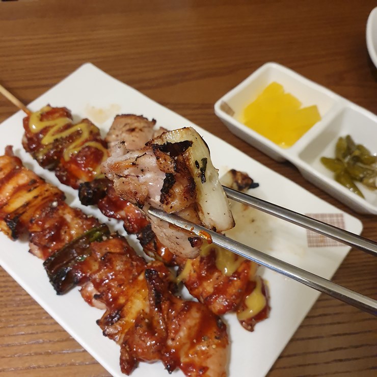산책 중 닭꼬치 굽는 냄새를 이기지 못해 남편과 같이 들어가고 말았지요.