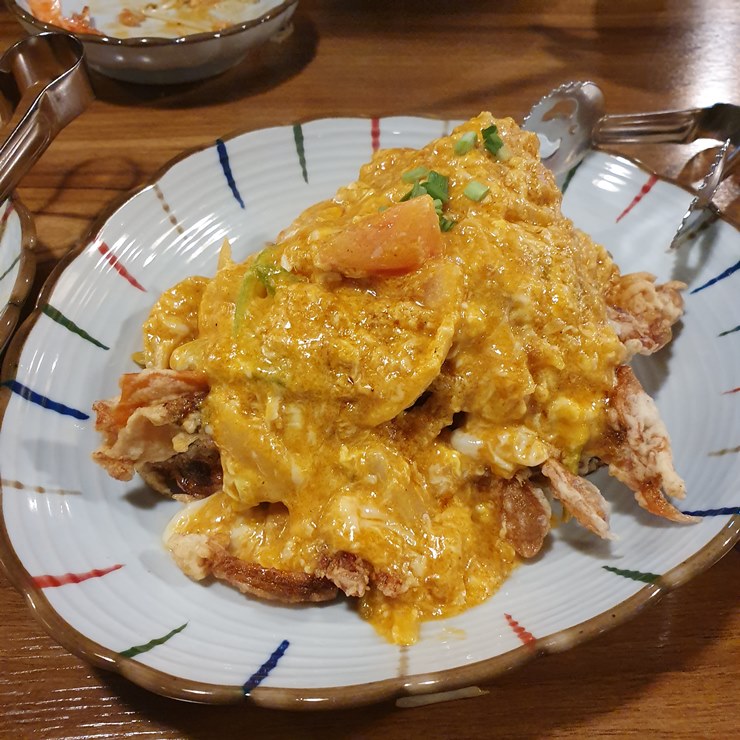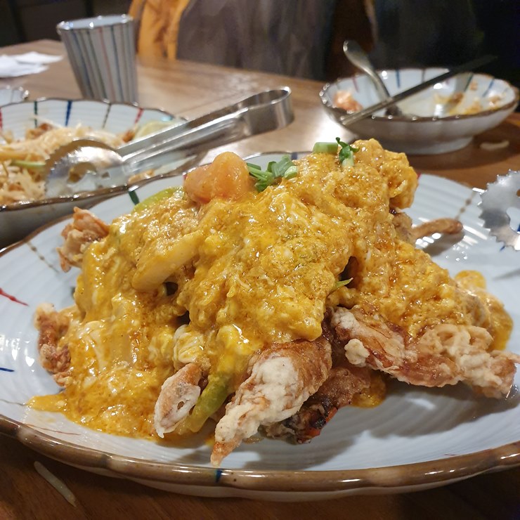 게튀김위에 부드러운 카레가 얹어진 뿌팟퐁커리가 나왔습니다.