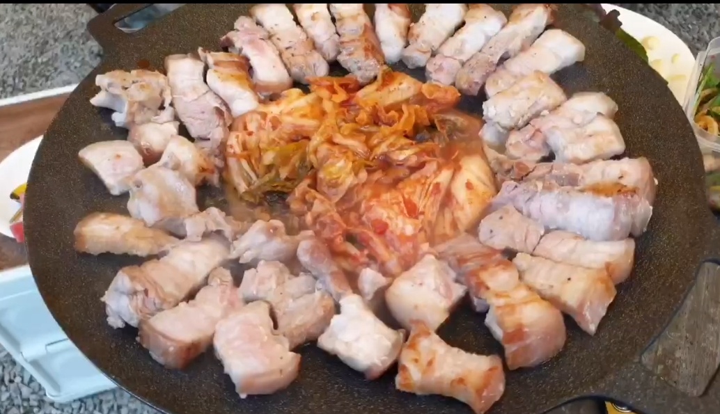 삼겹살 기름이 중간에 모이면, 김치 구워먹기도 정말 좋지요.