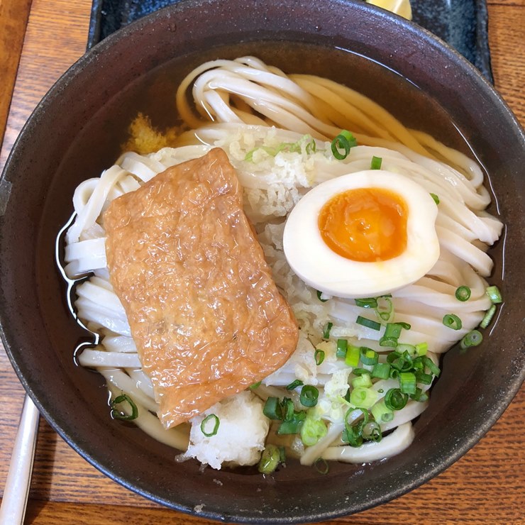 따뜻한 가케국물과 반숙계란, 그리고 유부조림을 추가한 가마타마 우동 입니다.