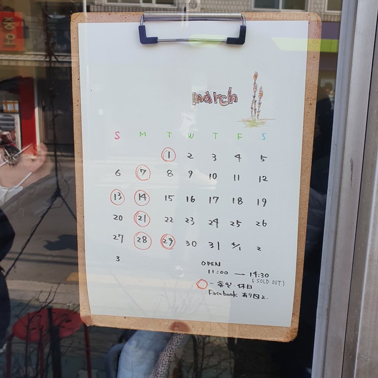 가타쯔무리 영업일은 매 달 일정한 것이 아니고, 아래 사진처럼 휴무일에 동그라미를 쳐 놓았습니다.