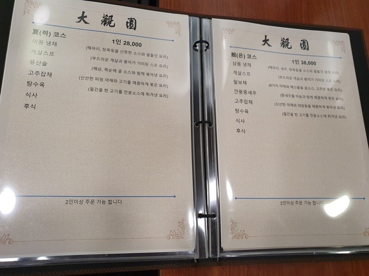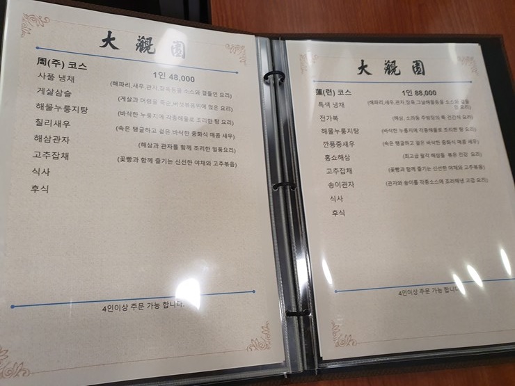 참고용 대관원 가격 및 메뉴판 보고 가겠습니다.