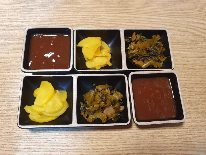 꼬들단무지, 갓김치 볶음, 돈까스 소스 입니다.