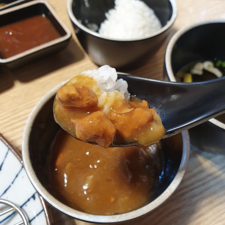 카레는 고기 카레로, 야채보다 고기가 듬뿍 들어간 카레입니다.