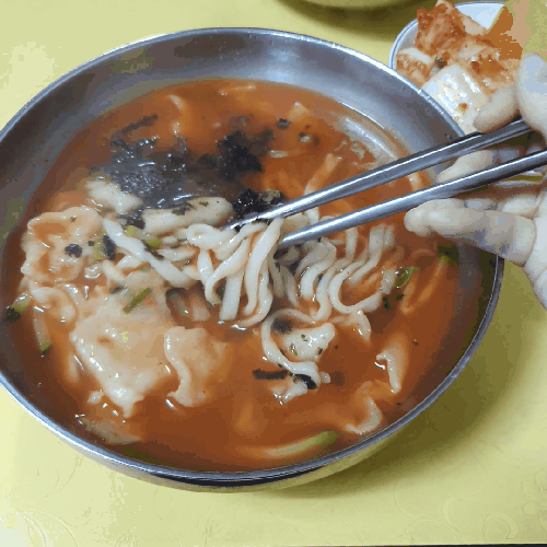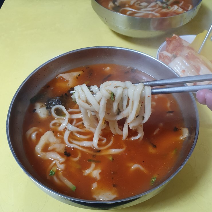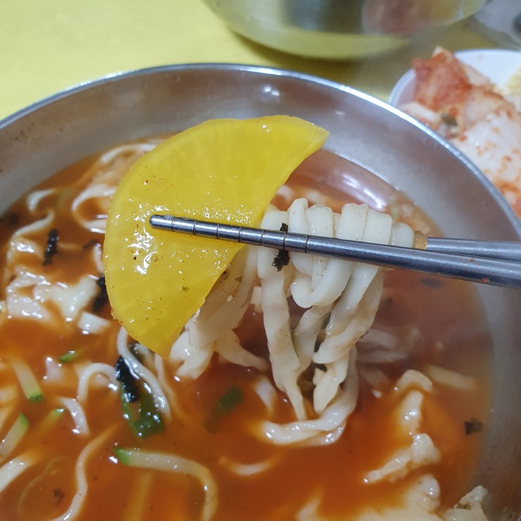 단무지의 시원하면서도 새콤달콤 아삭한 식감과 뜨끈하고 얼큰한 칼국수.