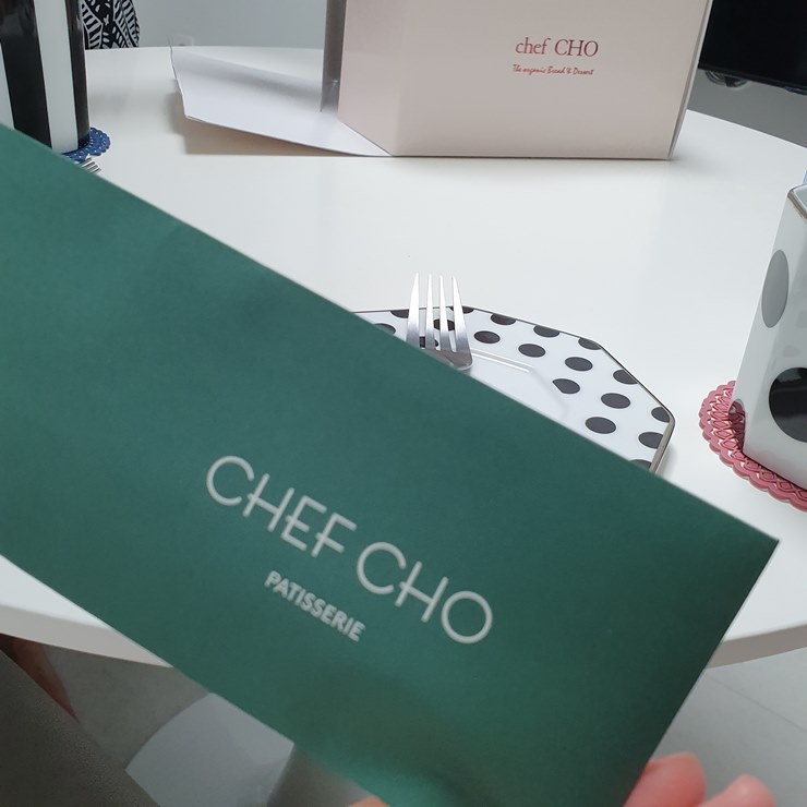 chef cho 라고 쓰여진 케이크 상자, 그리고 칼과 초가 들어있는 봉투입니다.