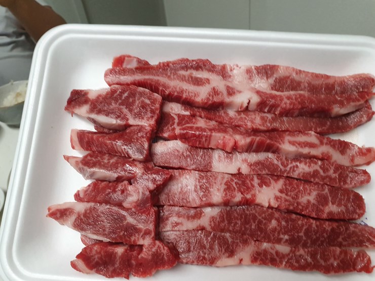 꽃등심 같은 경우에는(혹은 등심) 중간에 낀 소고기 기름 제거를 안해주는 경우가 많더라구요.