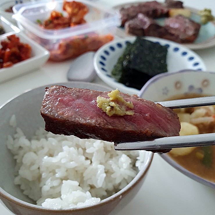 채끝 스테이크는 와사비 얹어 먹는게 더 맛있더라구요.