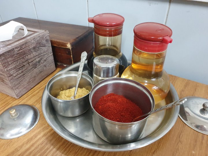 식초, 간장, 고춧가루, 겨자 등이 정갈하게 놓여져 있습니다.