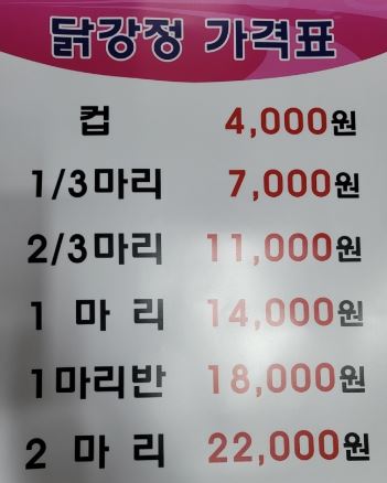 큐스 닭강정은 컵, 1/3마리, 2/3마리, 한마리, 한마리 반, 두마리 기준으로 가격차이가 있습니다.
