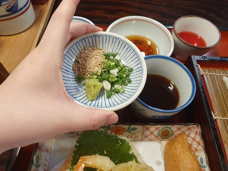 우동면을 찍어먹을 쯔유에 와사바, 쪽파, 통깨를 넣어줍니다.