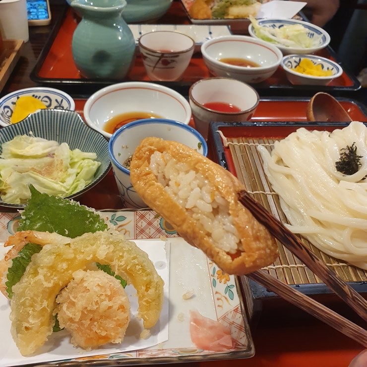 튀김, 유부초밥, 샐러드, 후식 등을 다 맛 볼 수 있는 우동정식을 추천드리고 싶습니다.