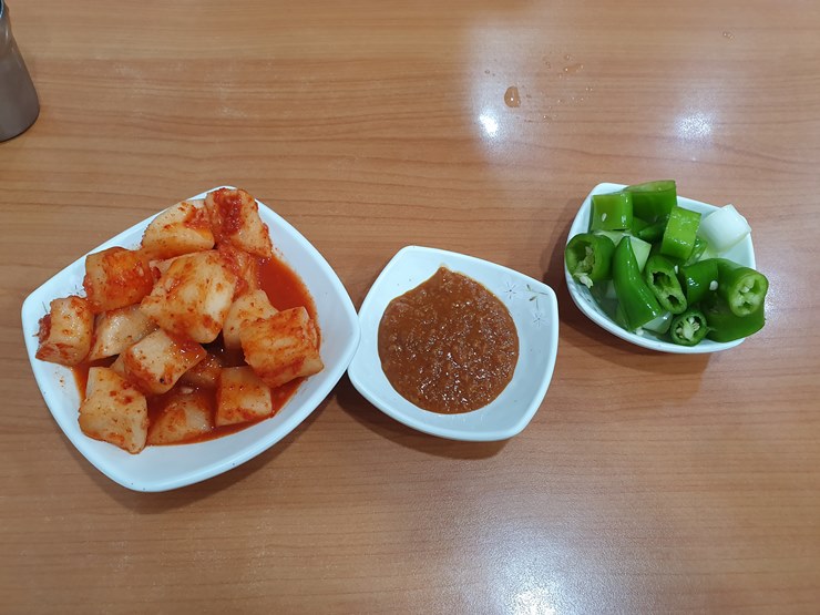 깍두기, 쌈장, 고추, 대파.