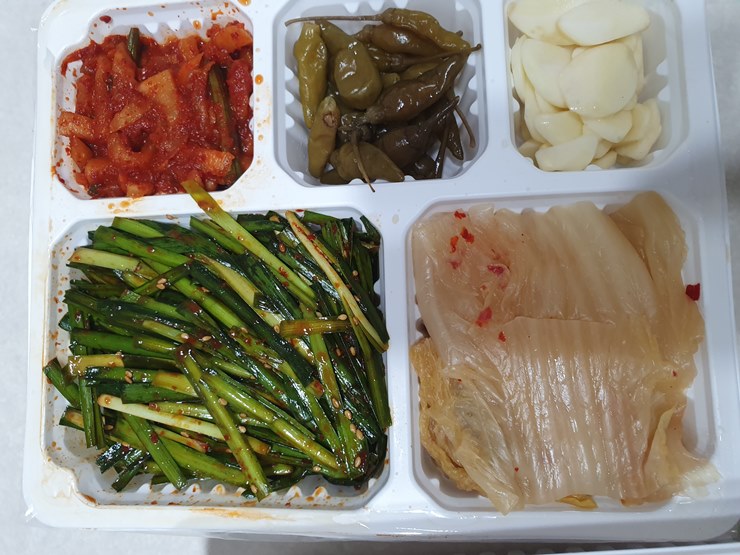씻은 묵은지, 무채, 부추무침, 땡초절임, 생마늘.