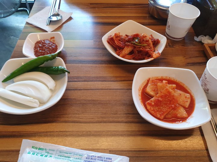 밑찬은 석박지, 겉절이, 쌈장, 양파, 청양고추입니다.