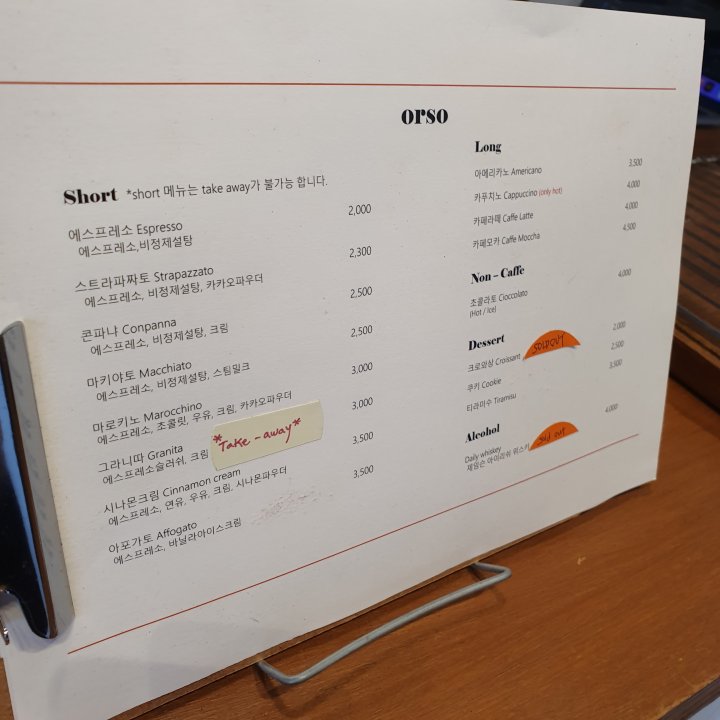 오르소에스프레소바 가격 및 메뉴판입니다.