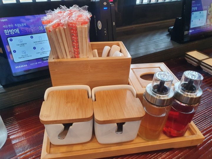 그리고 다시마식초와, 고추기름이 테이블마다 비치되어 있습니다.