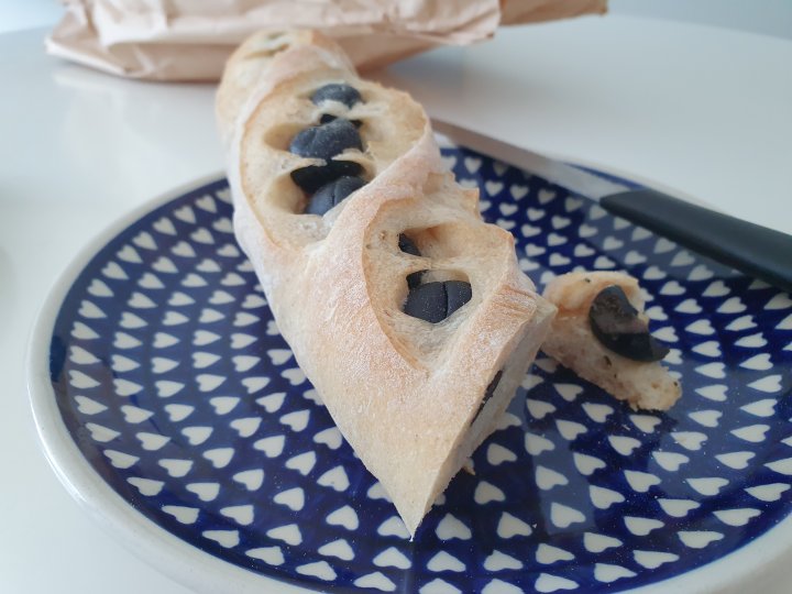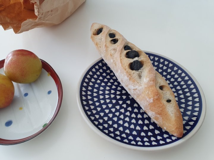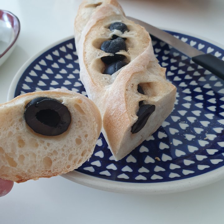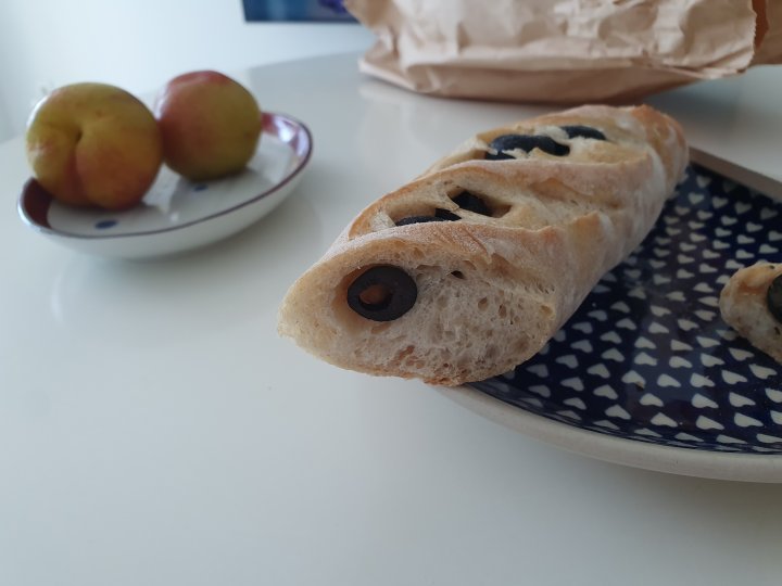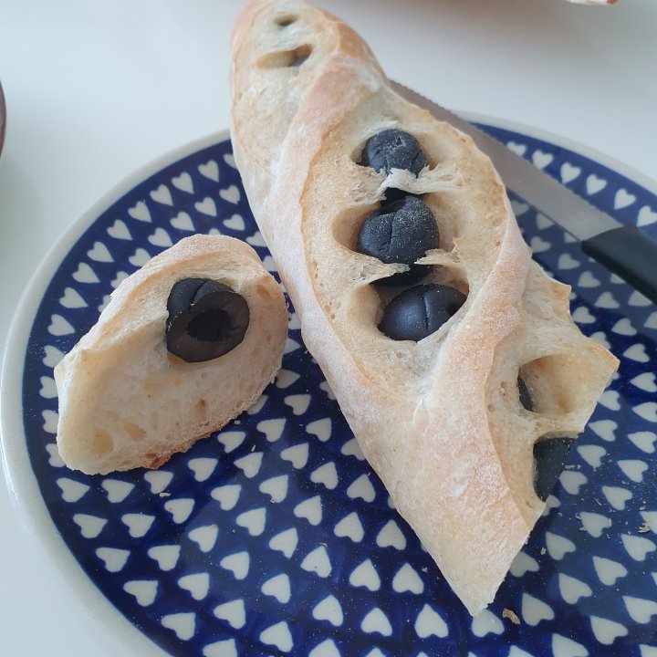올리브가 박혀있는 얇고 길쭉한 모양의 바게트 라고 생각하시면 됩니다.
