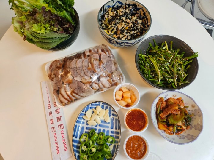 족발을 포장하면 기본찬으로 쌈채소(상추, 깻잎, 마늘, 고추)와 쌈장 새우젓, 그리고 깍두기를 줍니다.
