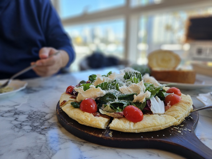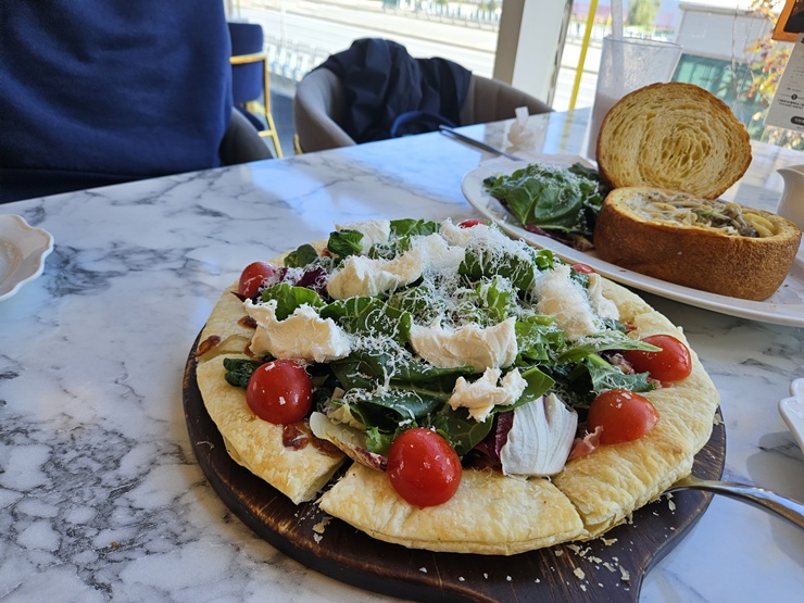 패스츄리 도우에 리코타 치즈 샐러드가 올라간 피자임.