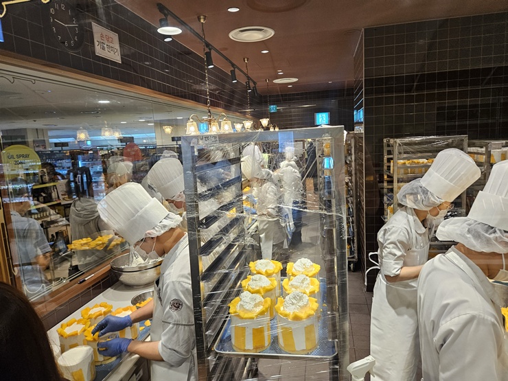 기계처럼 케이크를 만들고 있는 직원분들.