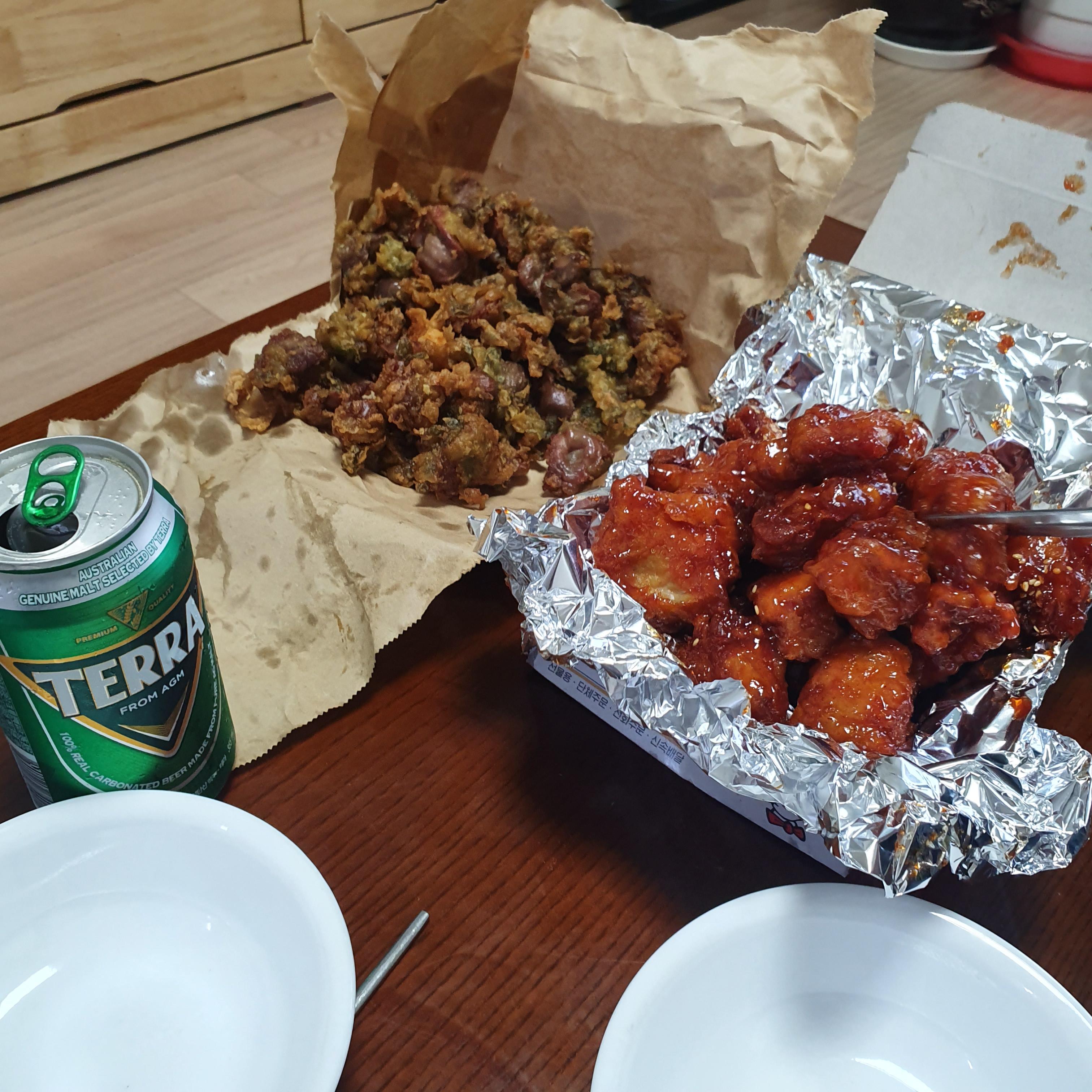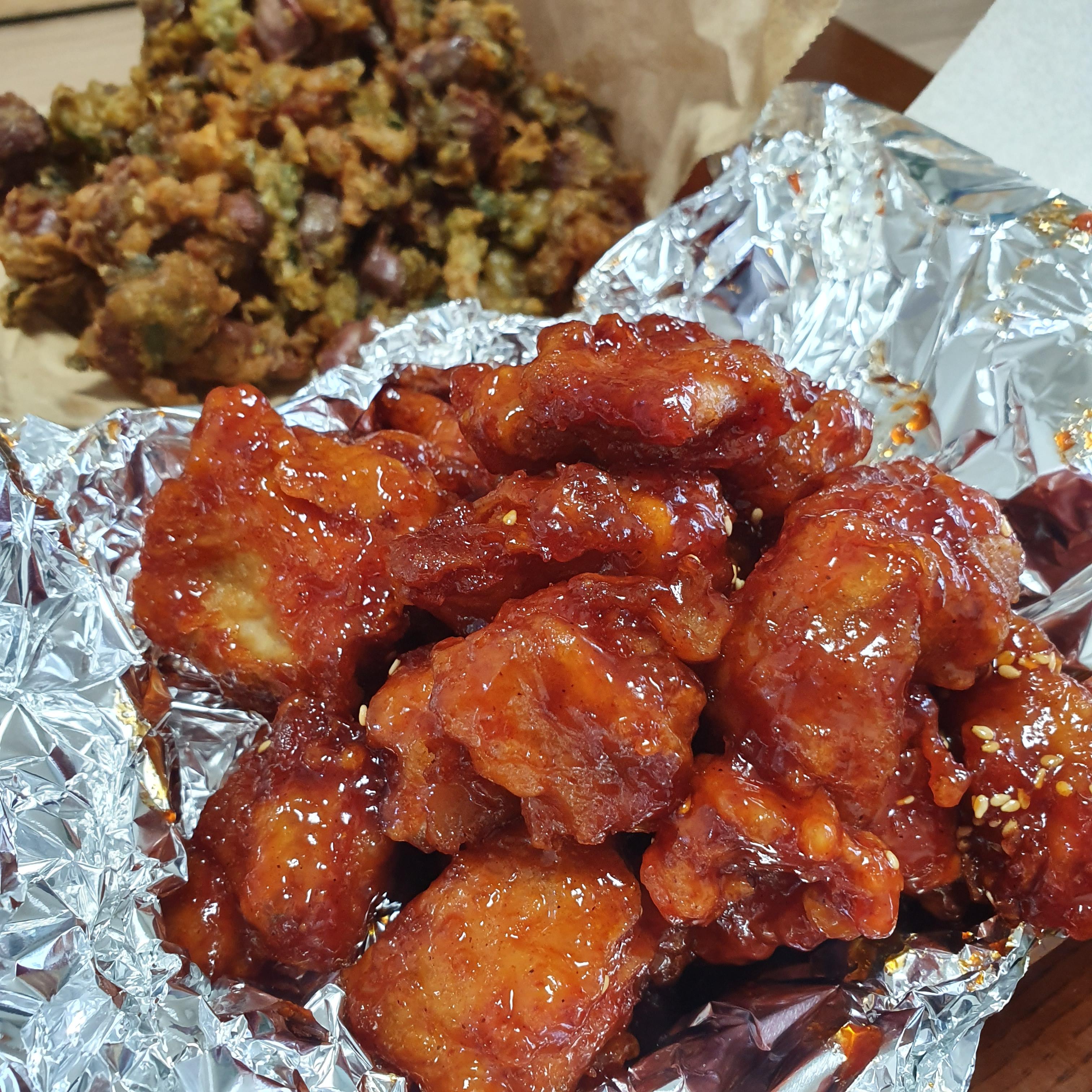 닭강정, 순한맛과 매운맛이 있는데 남편의 선택은 매운맛.