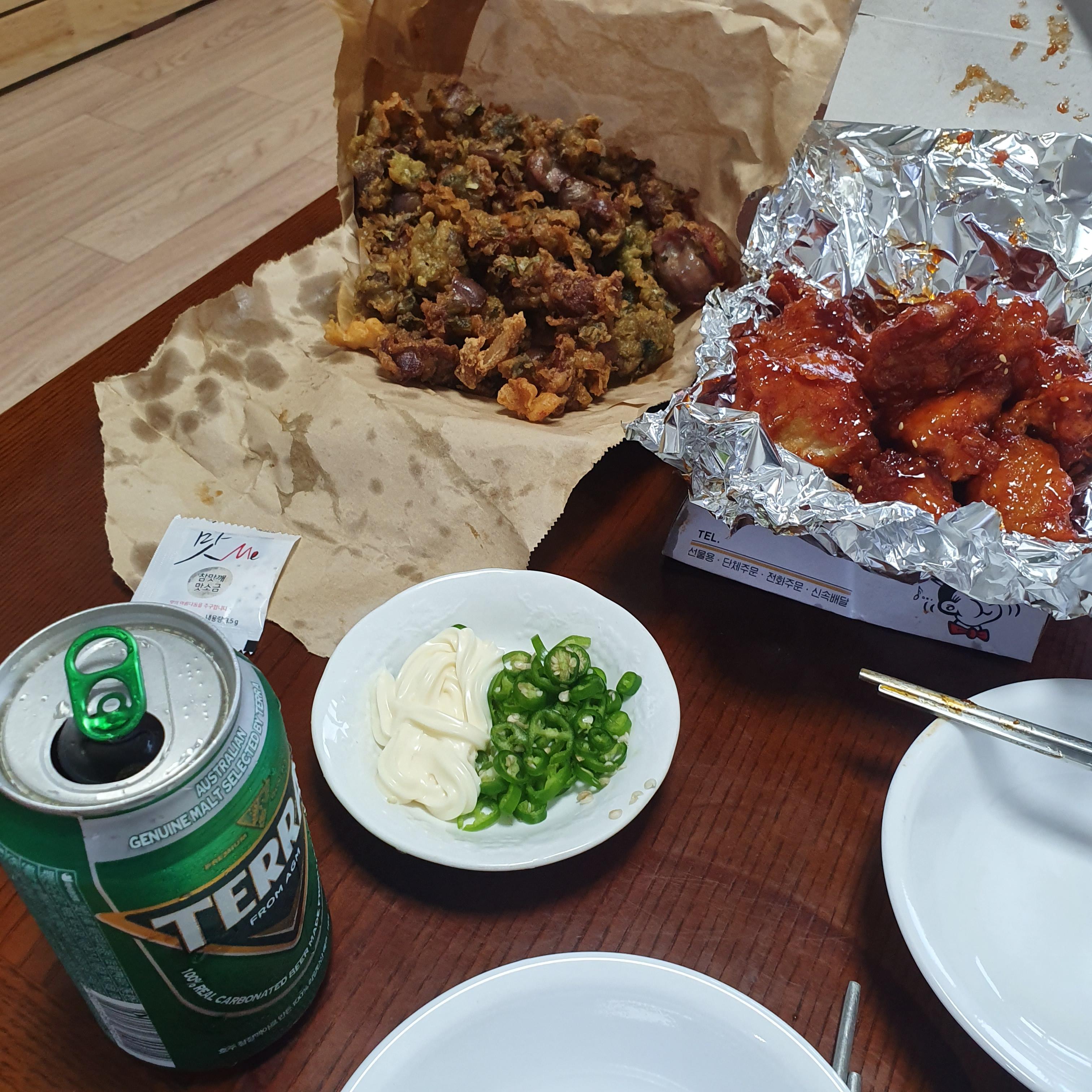 내가 처음 닭똥집 튀김의 맛을 알려주어, 남편도 맥주에 닭똥집 튀김 먹는 것을 좋아하게 되었다.