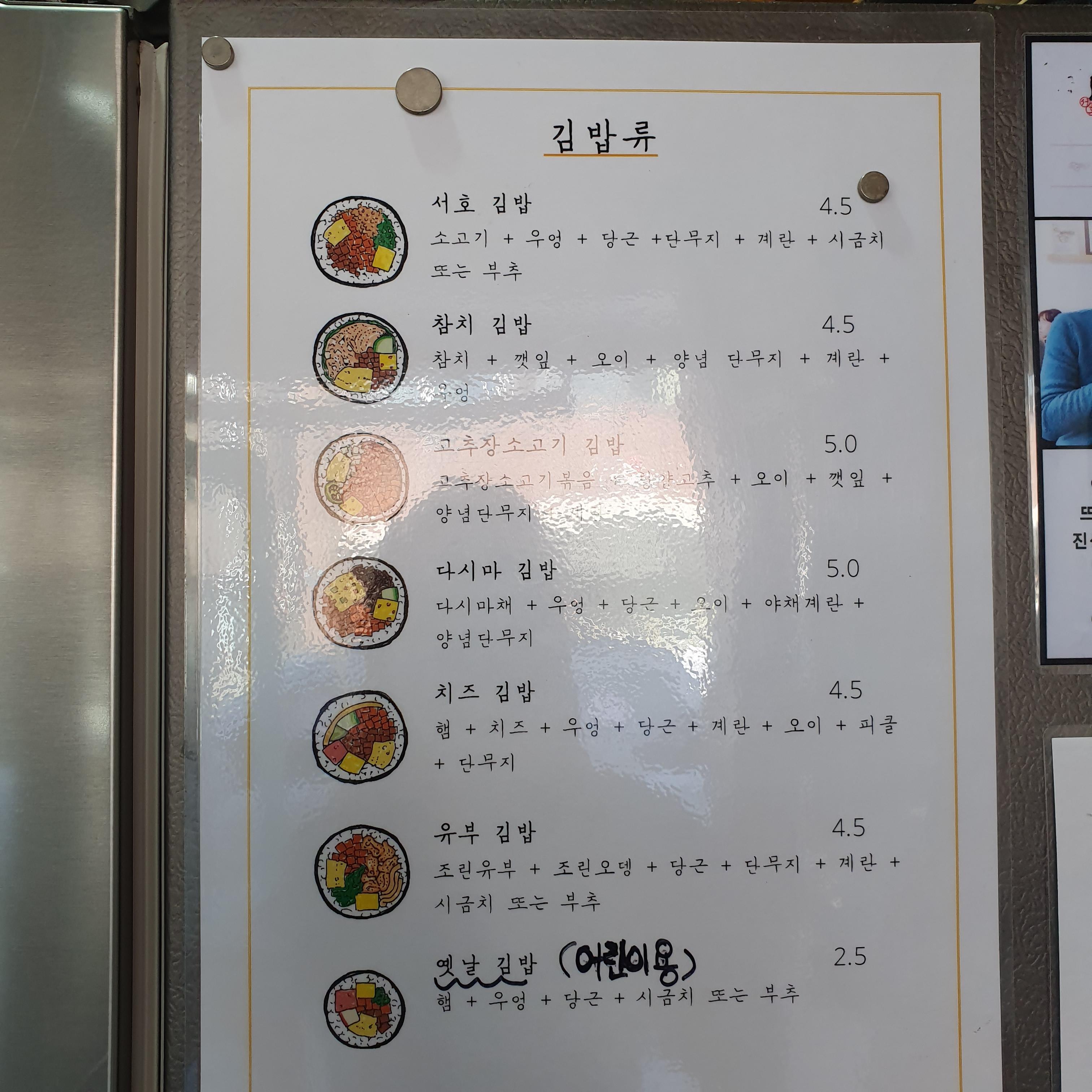 서호김밥, 참치김밥, 다시마김밥, 고추장소고기 김밥, 다시마 김밥, 치즈김밥, 유부김밥, 옛날김밥으로 선택지가 매우 다양해서 무엇을 먹을지 순간 너무 고민이 되었다.