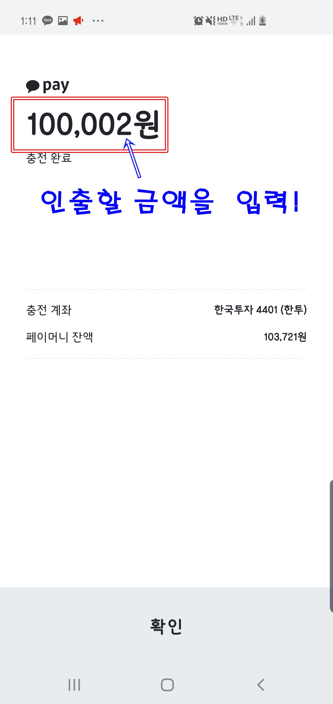 한투계좌에서 100,002원에 출금되어 카카오페이에 100,002원이 충전이 완료되었어요.