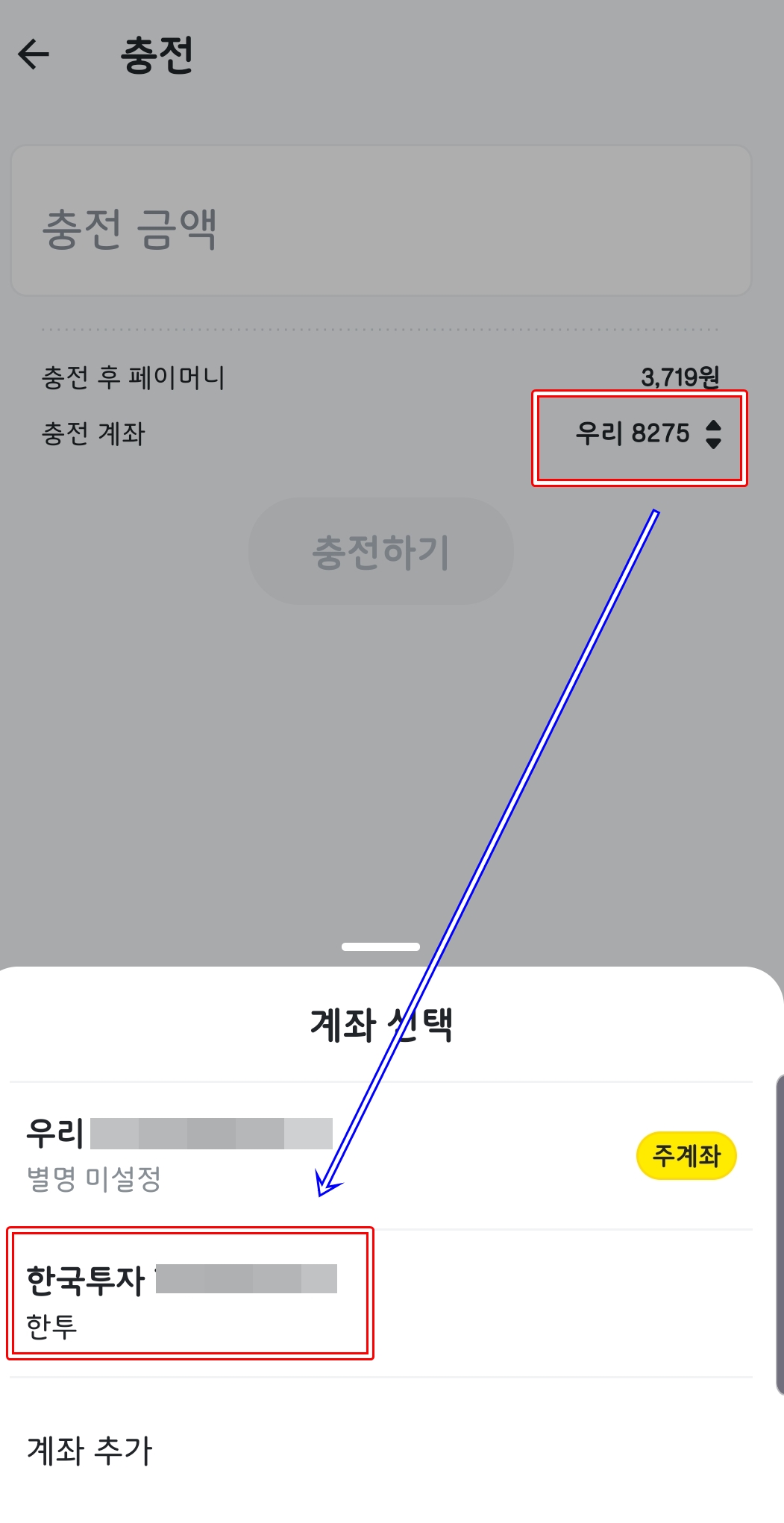 충전 계좌를 한국투자증권 계좌로 바꿔주세요.