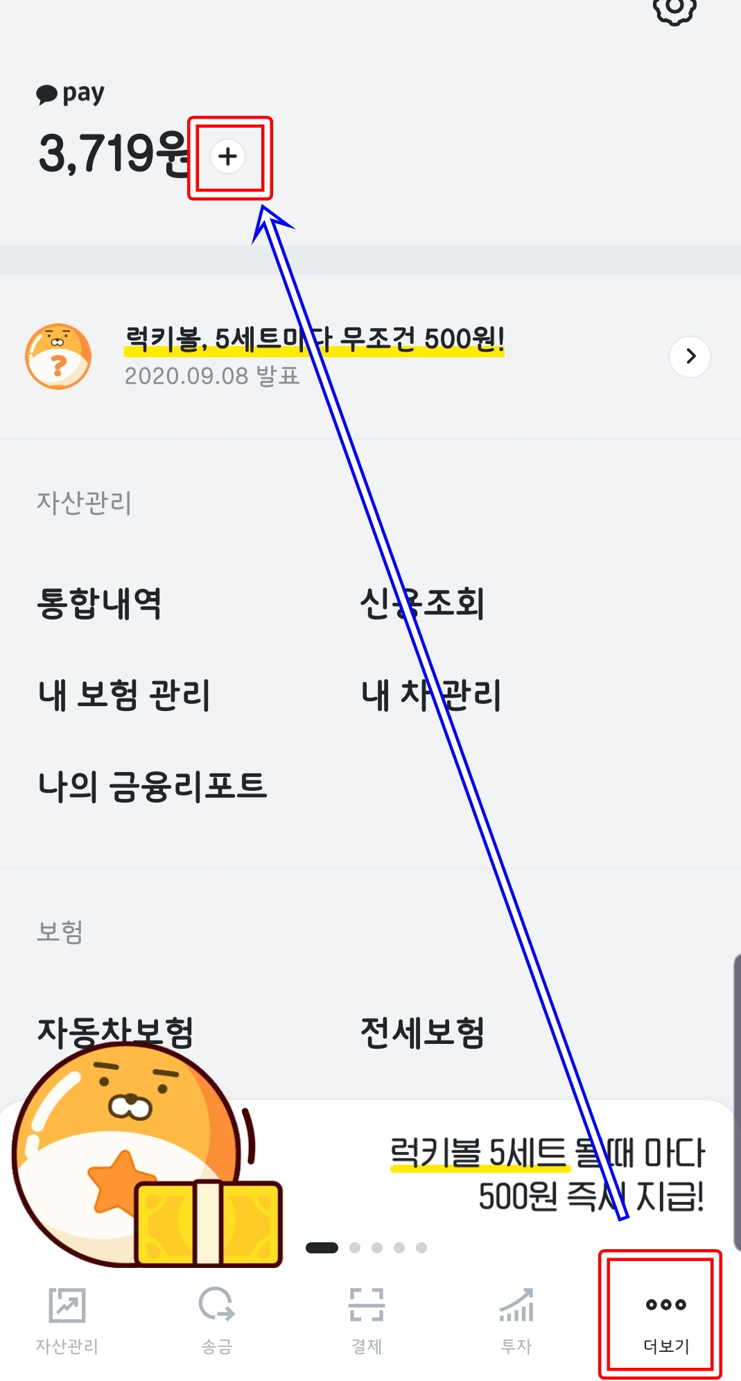 하단의 더보기를 눌러서 페이 머니 옆에 + 버튼을 눌러줍니다.