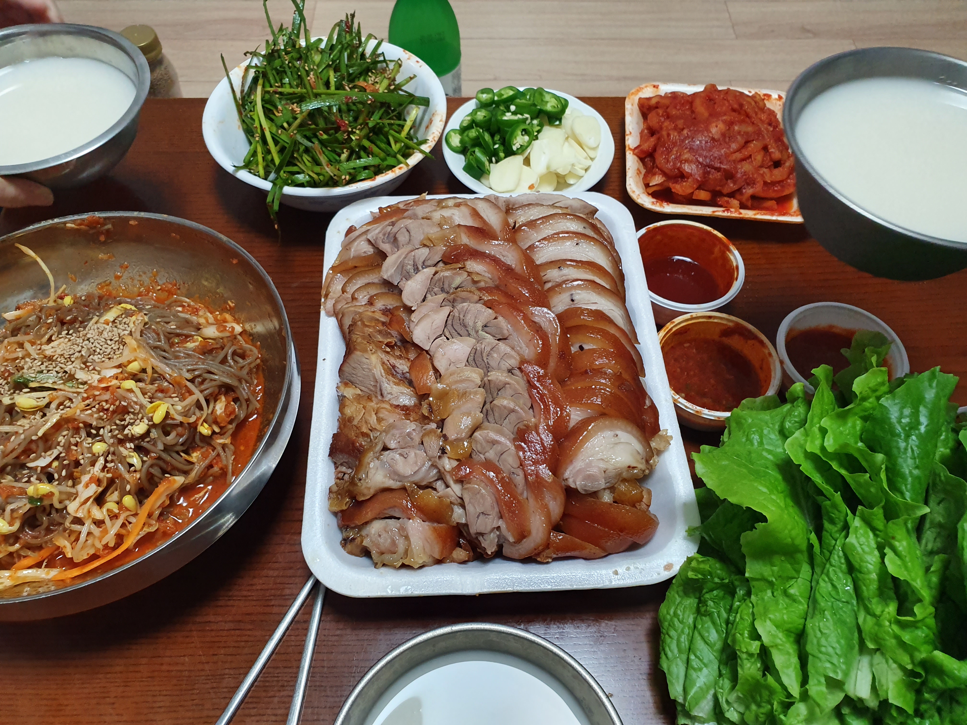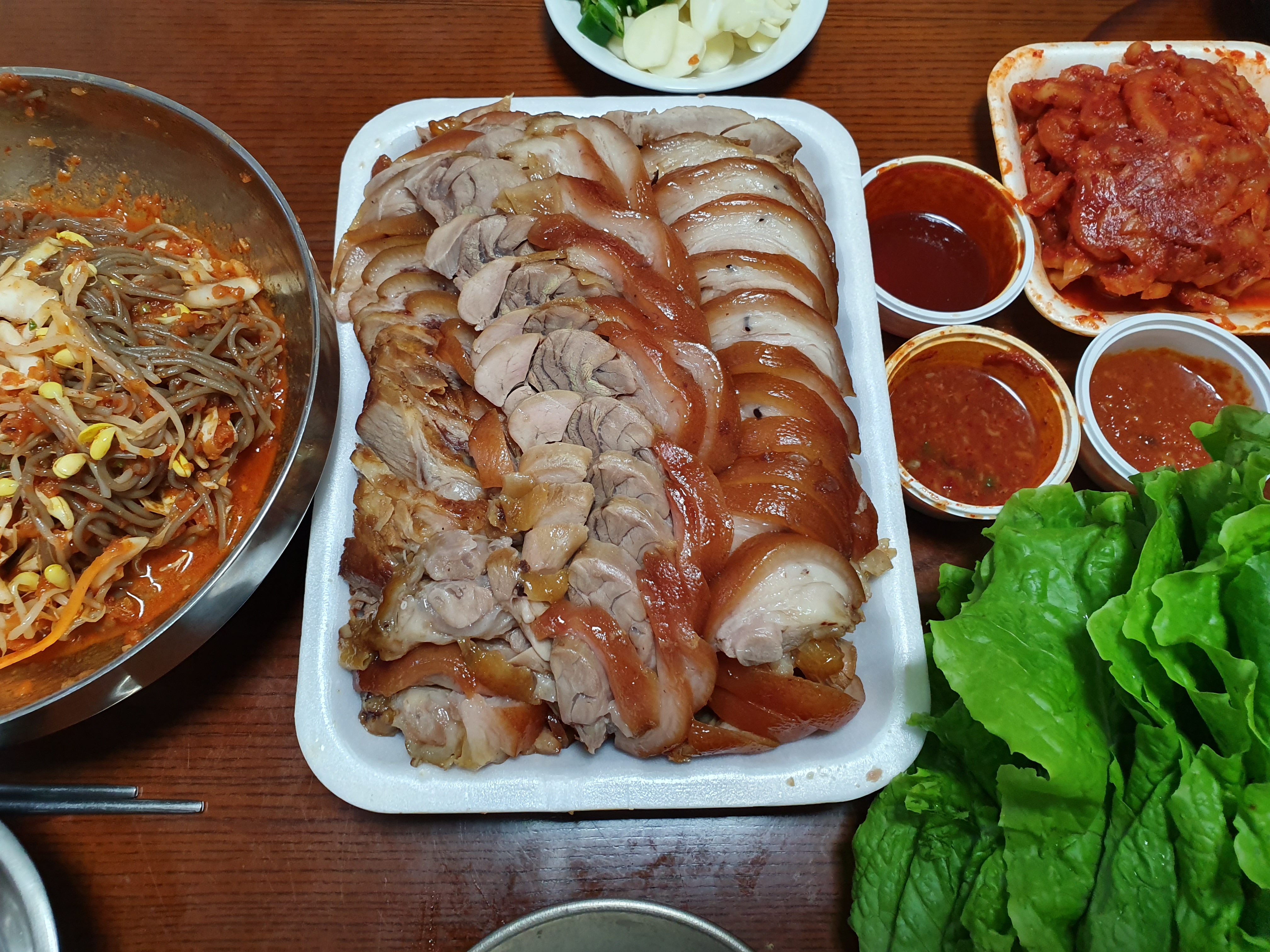 족발을 포장하면 기본적으로 쌈야채, 새우젓, 쌈장, 초장, 미니막국수를 챙겨주십니다.