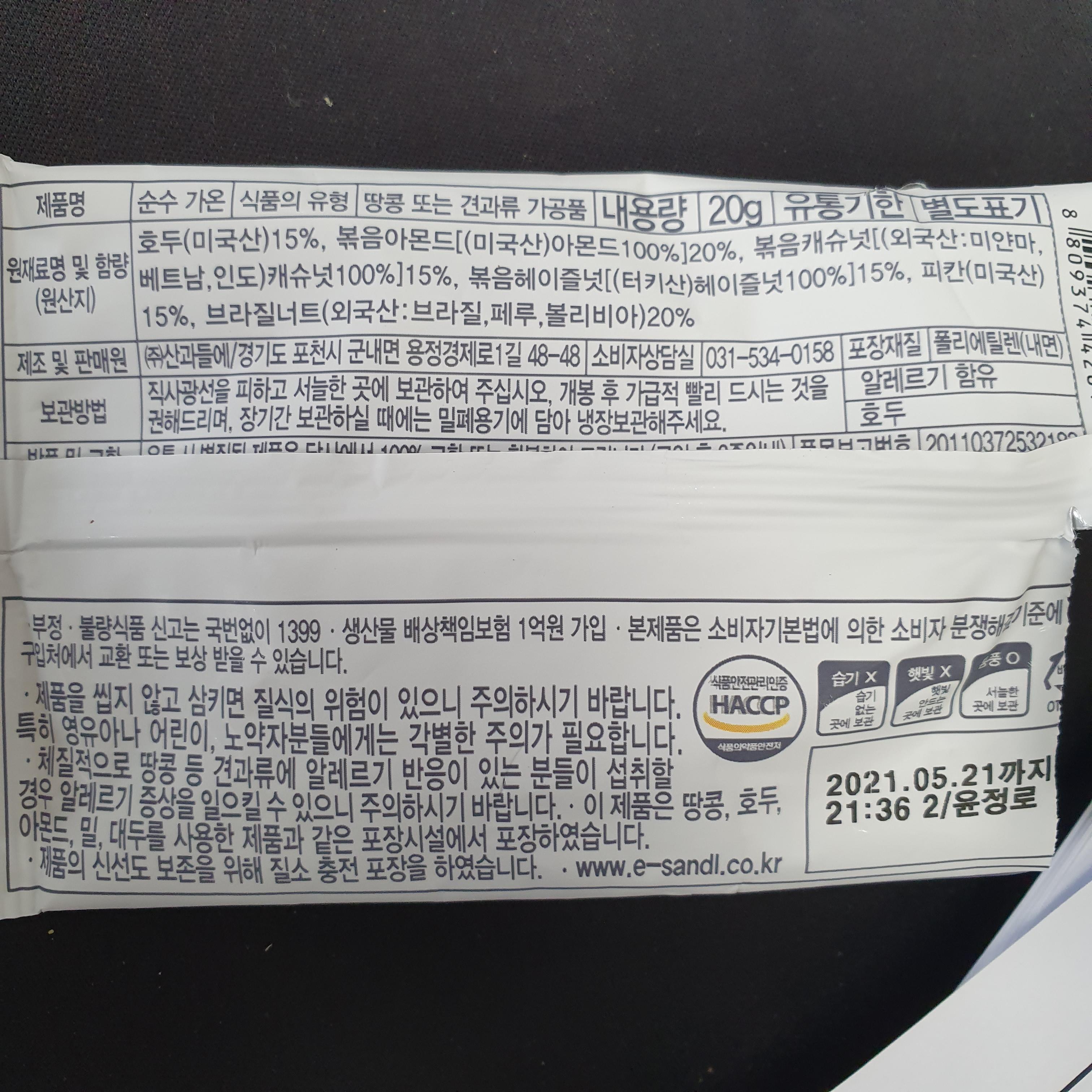 견과류 포장지 뒷면에는 원재료명 및 함량(원산지)가 표기되어 있습니다.