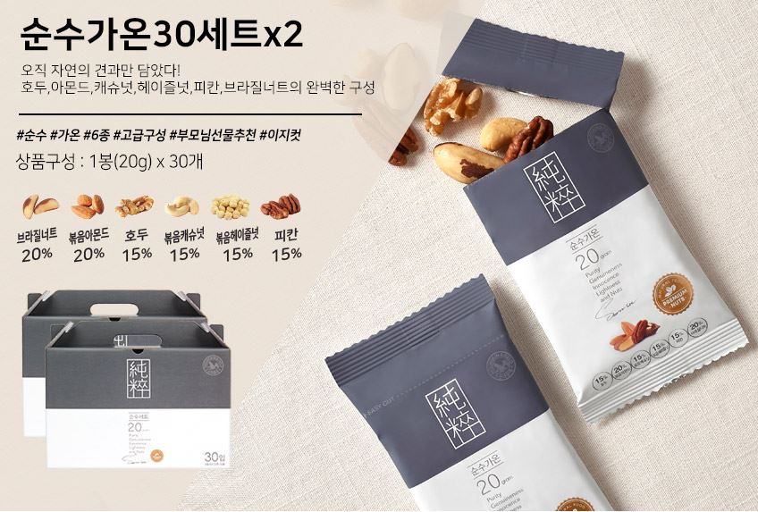 순수가온 구성 견과류 실물을 보여드릴게요.