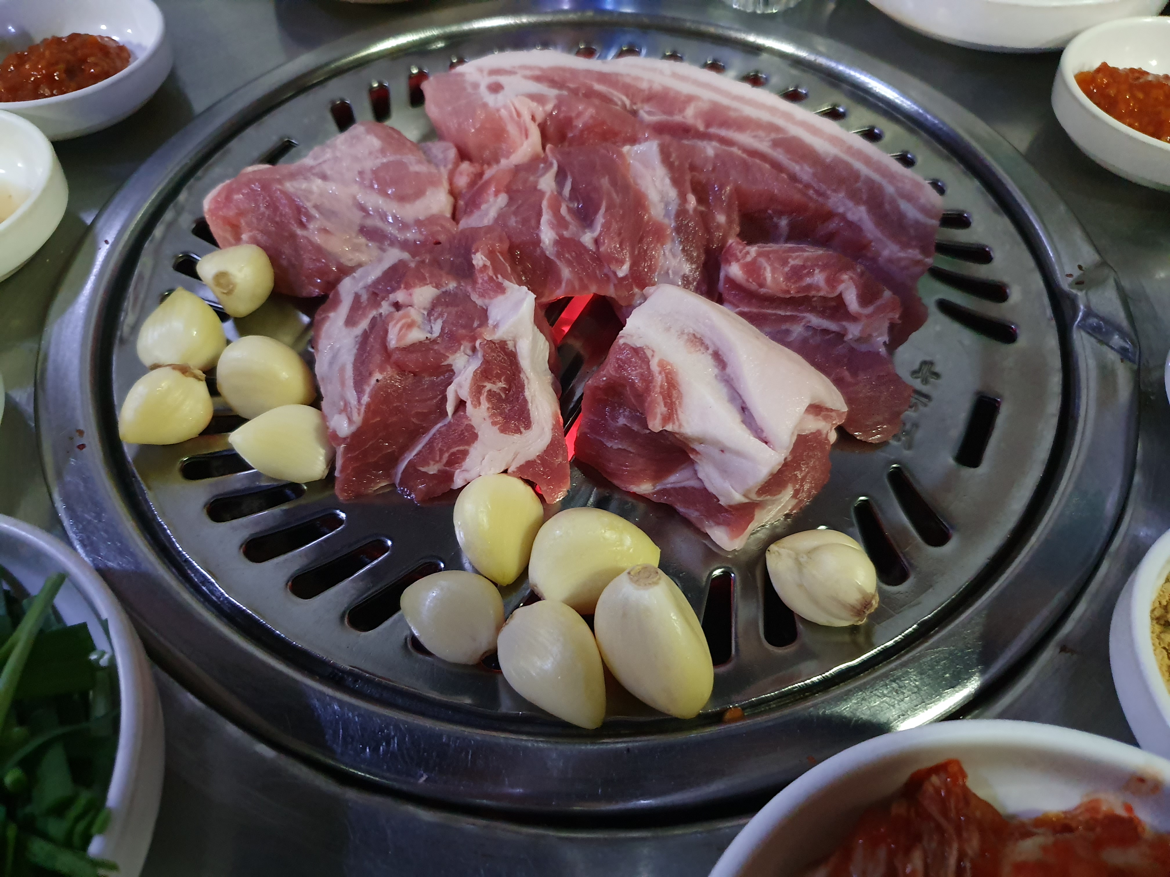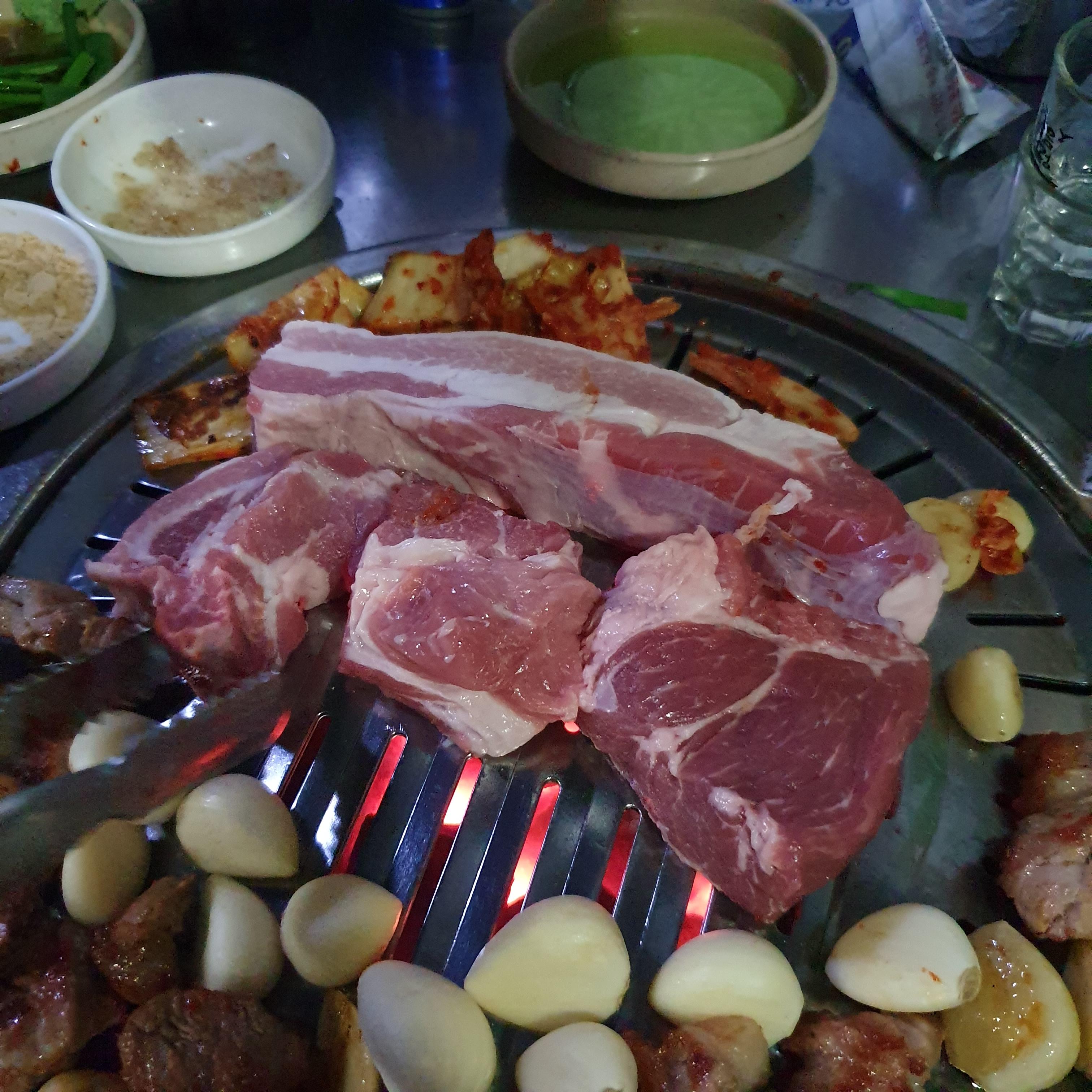 목살2, 삼겹1 그리고 통마늘이 불판위로 척!