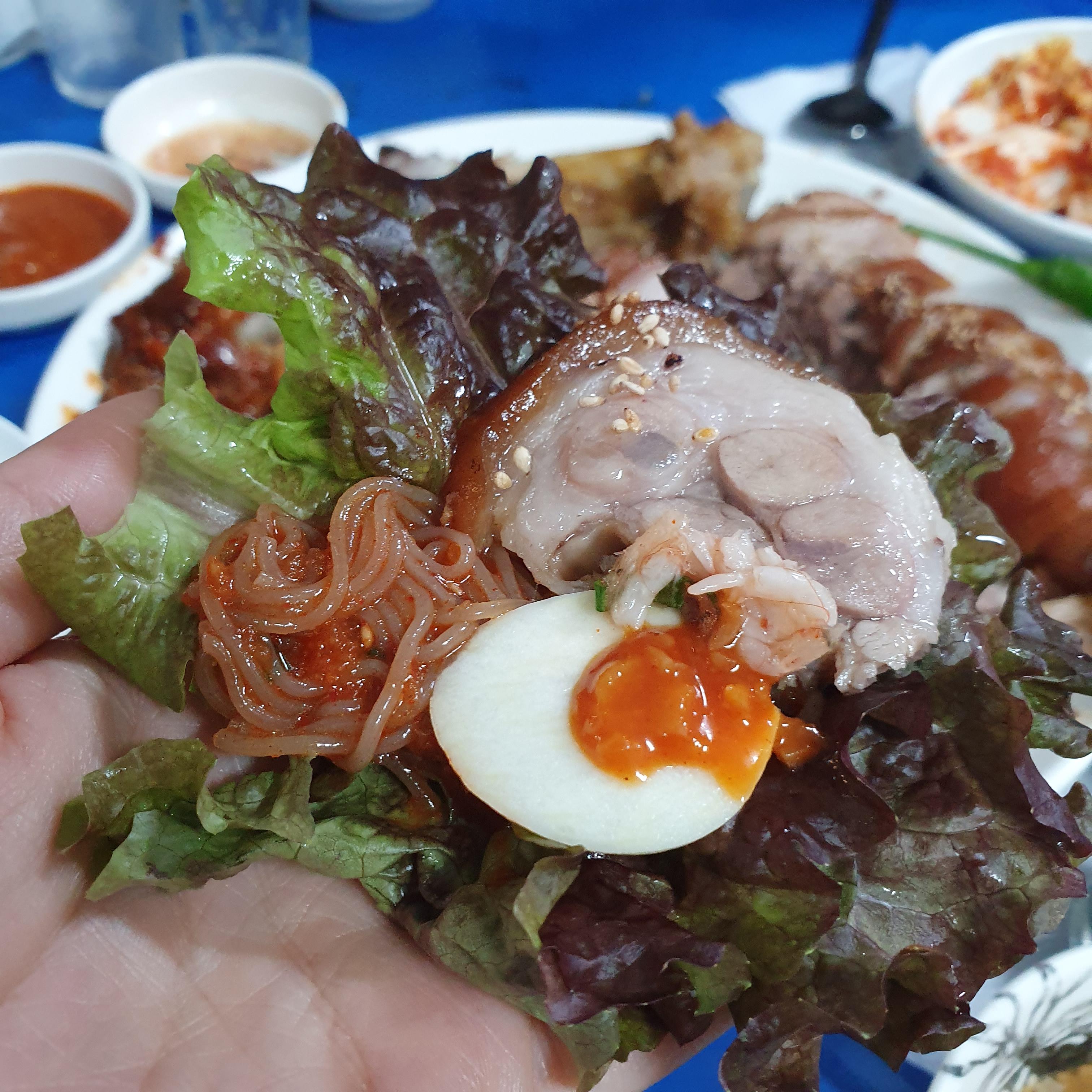 상추에 비냉, 족발, 새우젓, 마늘, 청양고추 넣고 한입먹으면