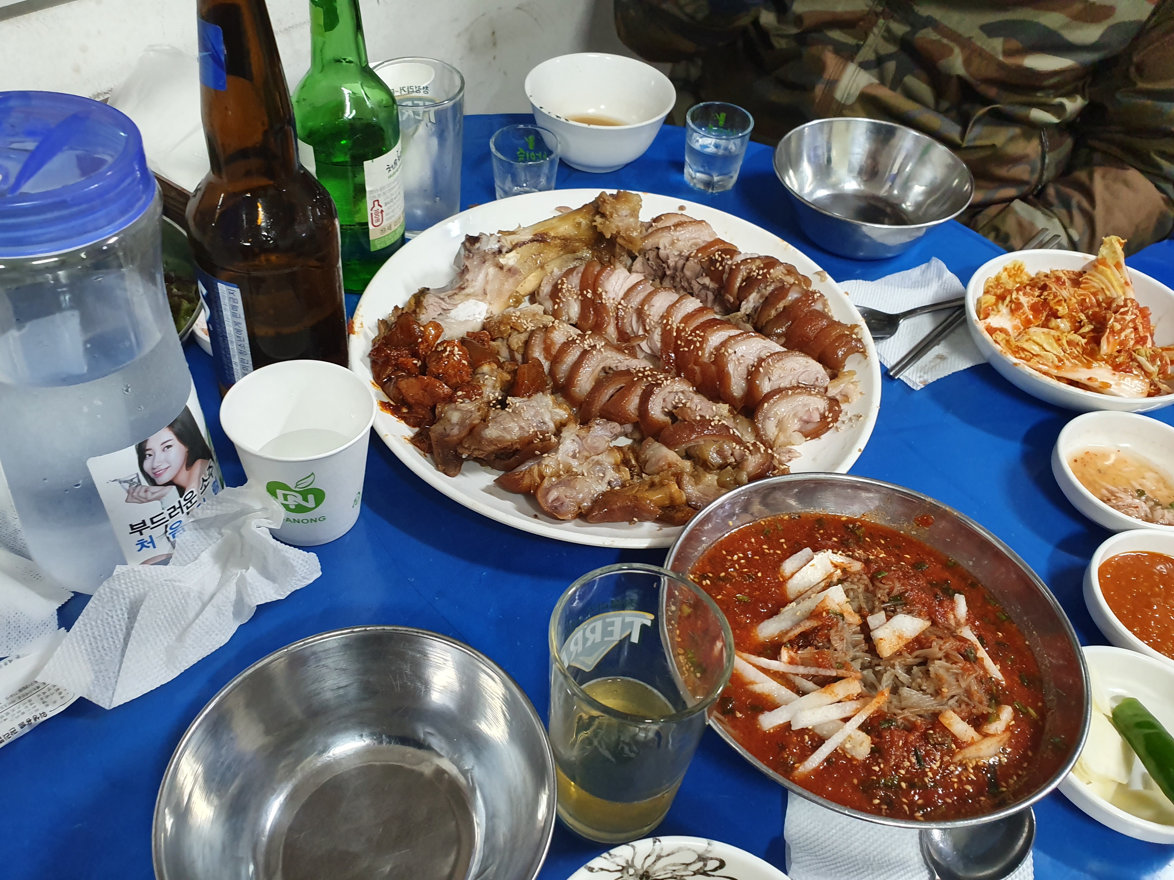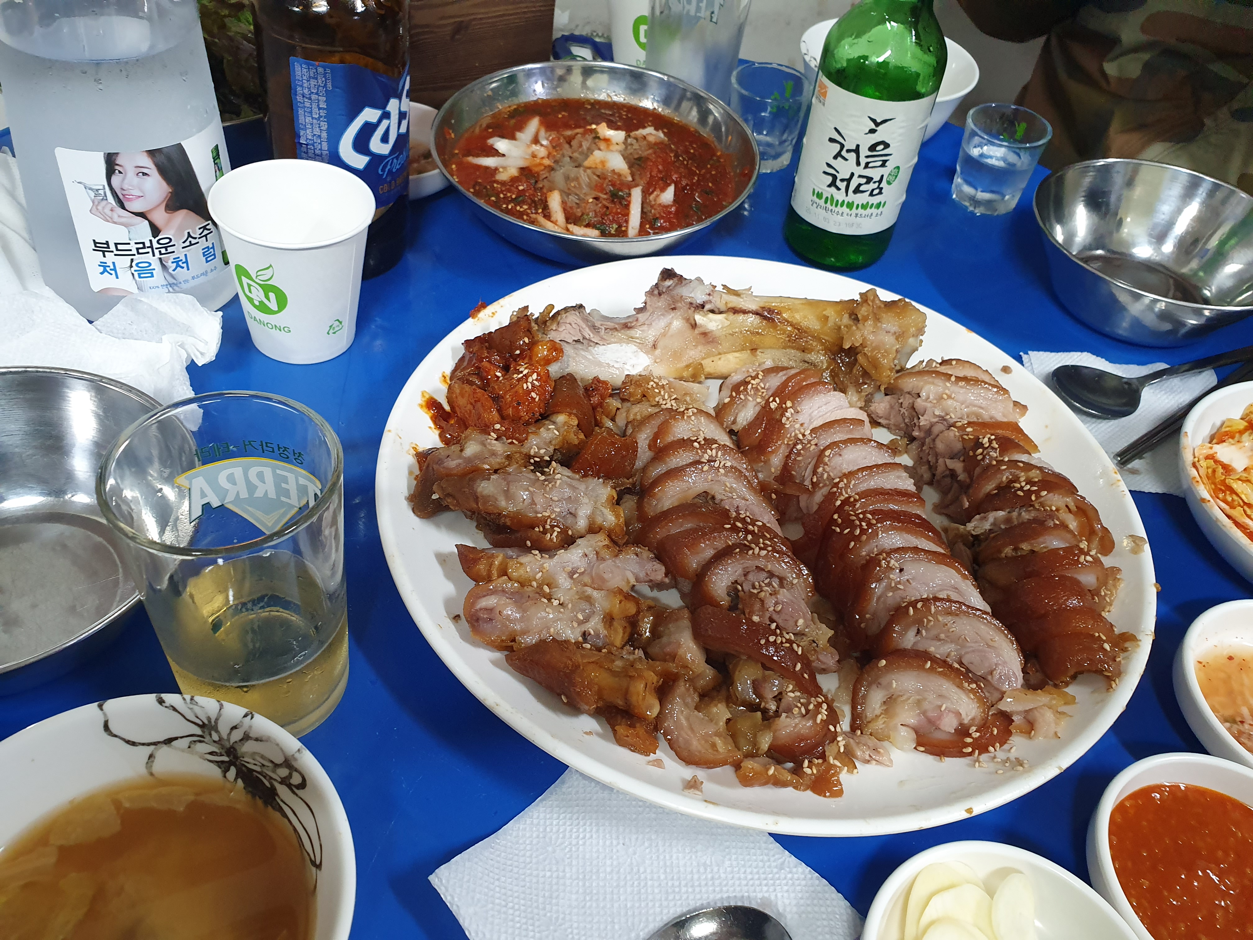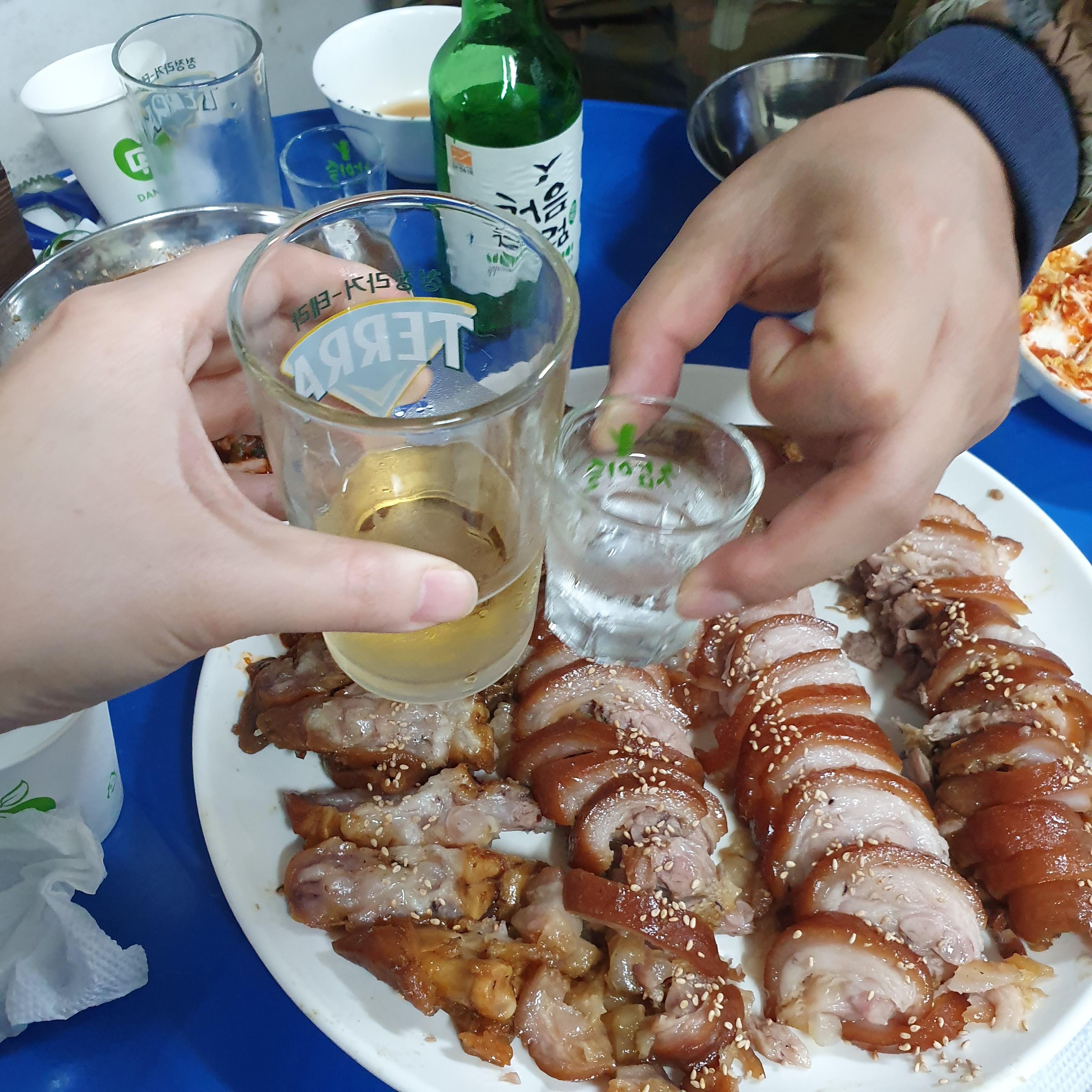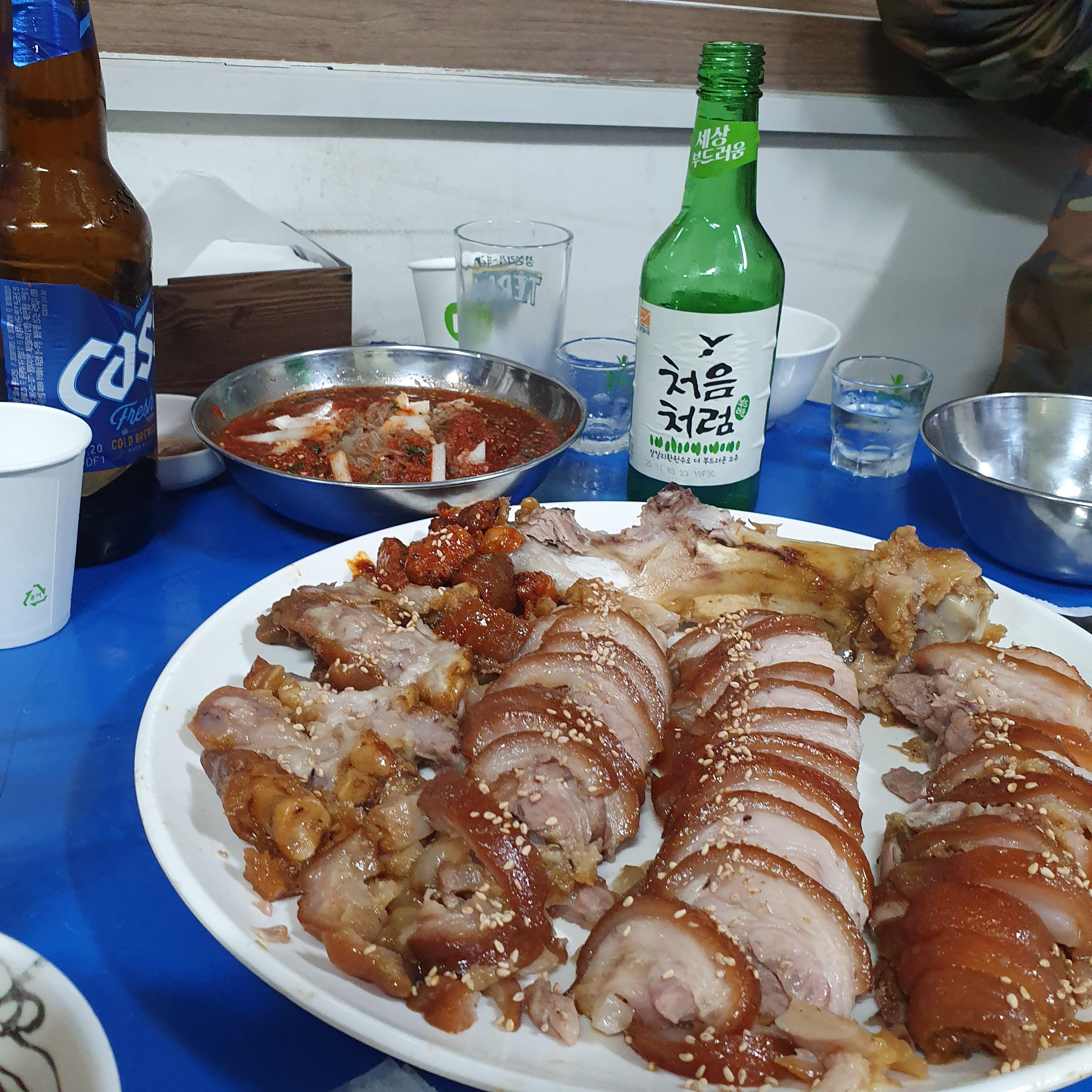 메뉴판을 보고 앞다리와 소주, 맥주를 시켰습니다.