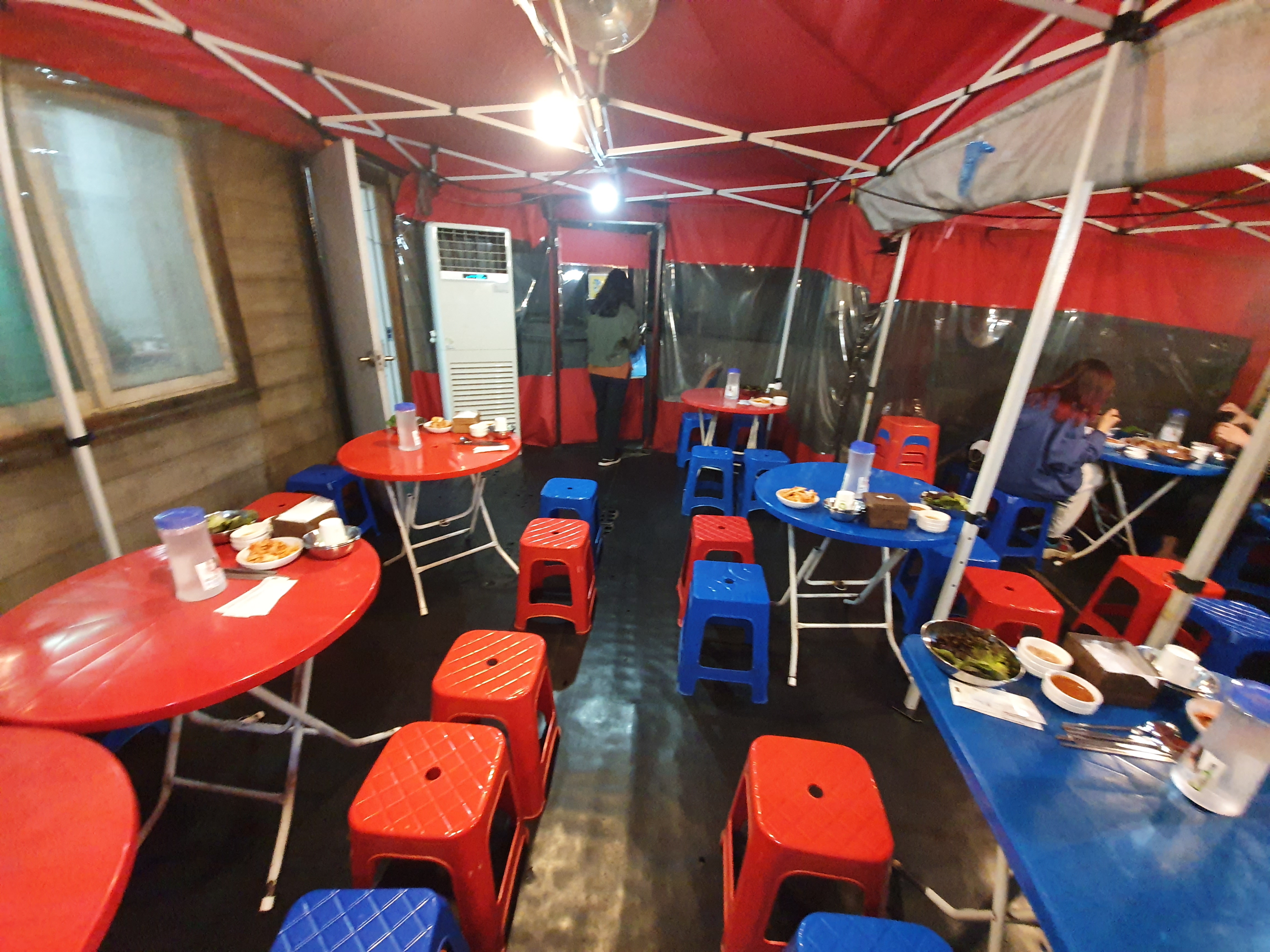 2층은 건물 꼭대기에 포장마차 느낌나게 테이블을 마련해 두었더라구요.