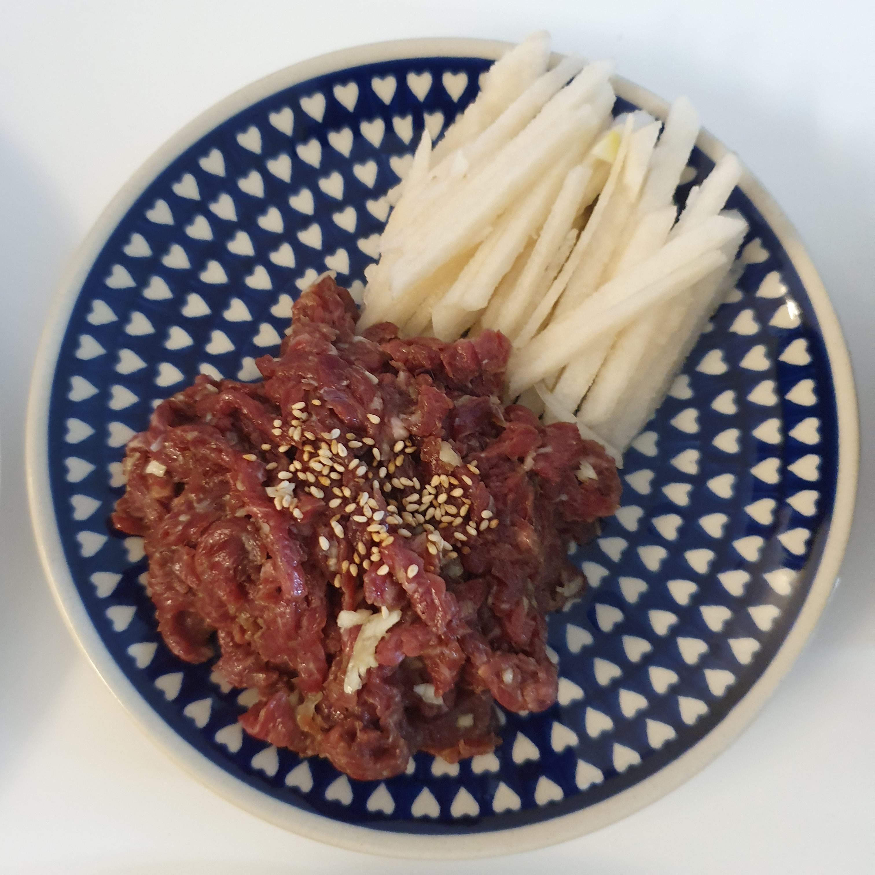 육회옆에 채 썬배를 디피하여 같이 냠냠하면 얼마나 맛있게요?