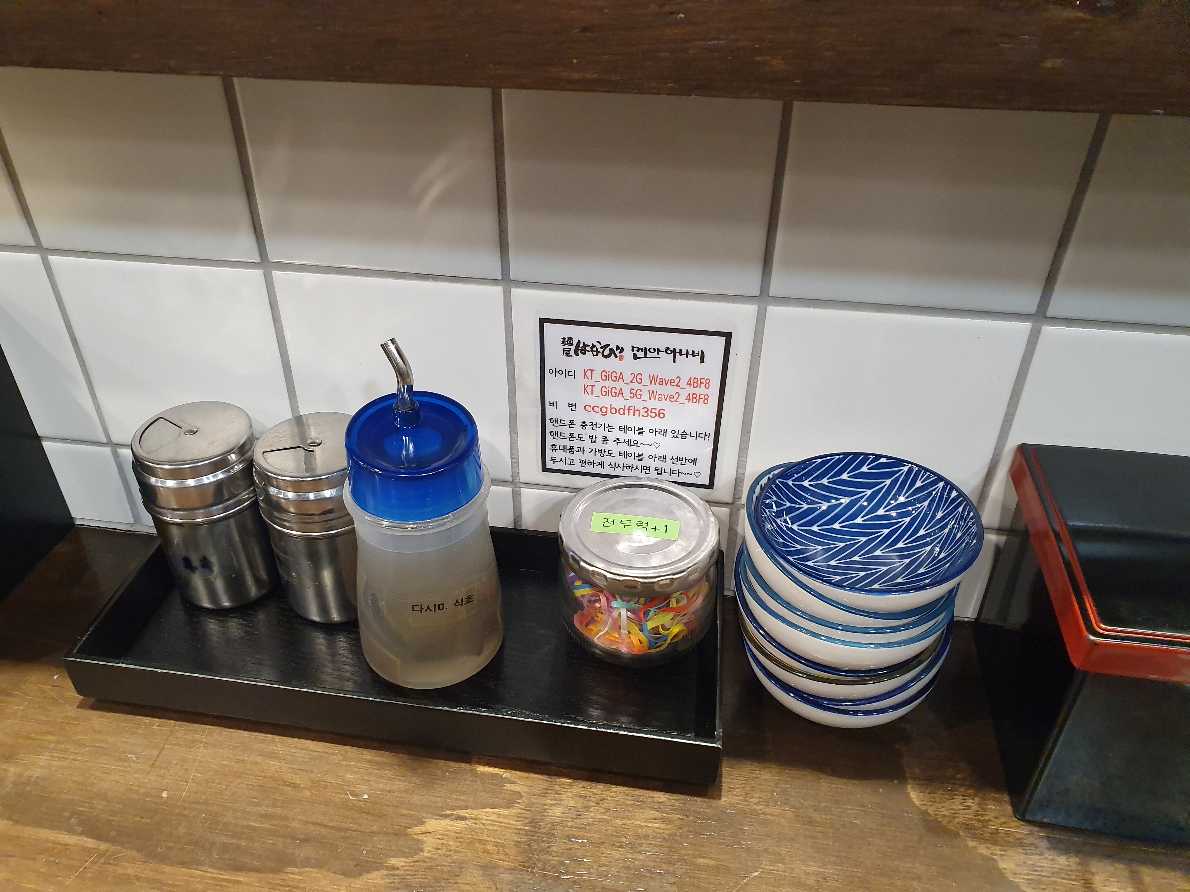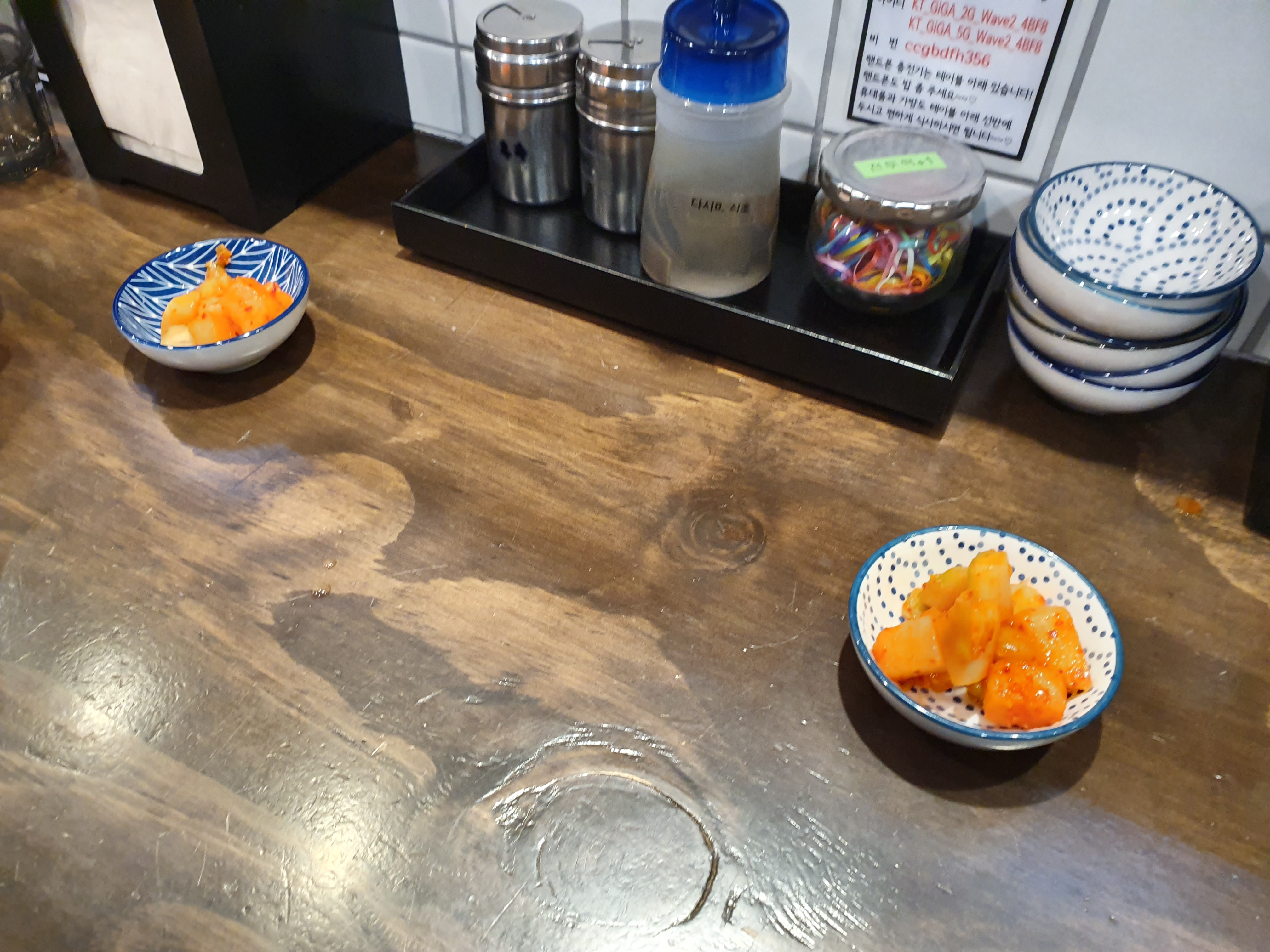 다시마식초, 시치미, 깍두기 등이 테이블위에 놓여져 있습니다.