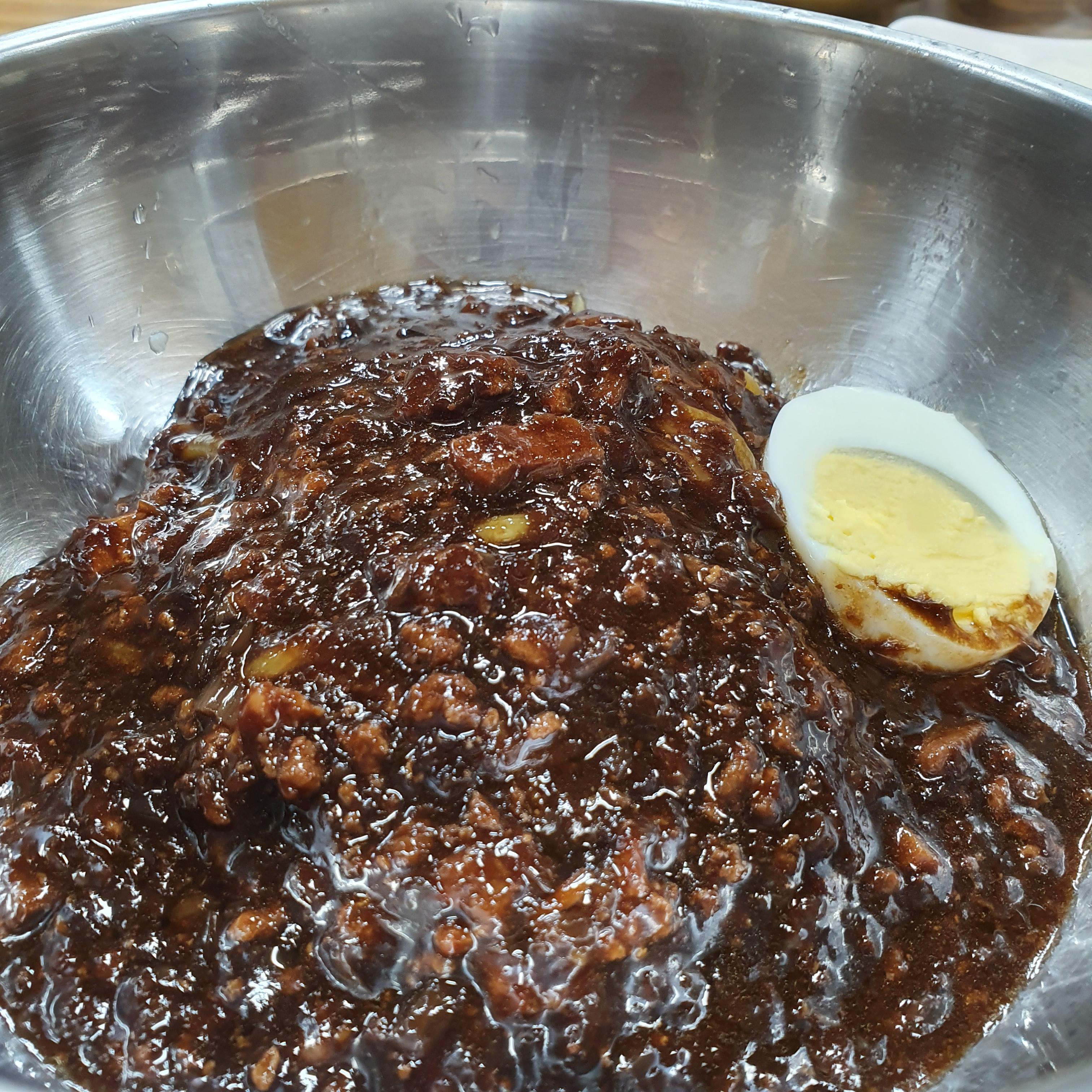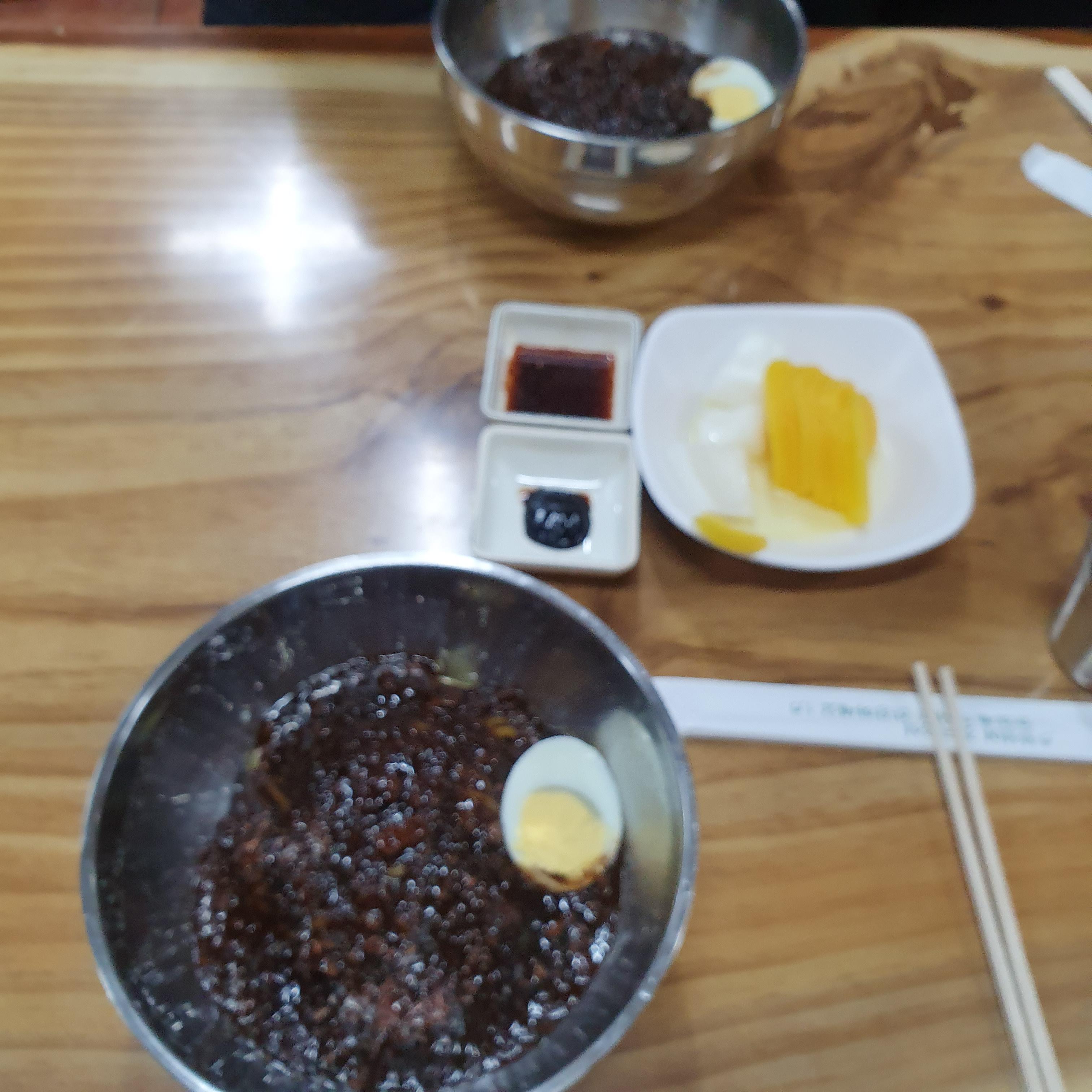 짜장에 삶은달걀 반개가 올라가 있습니다.