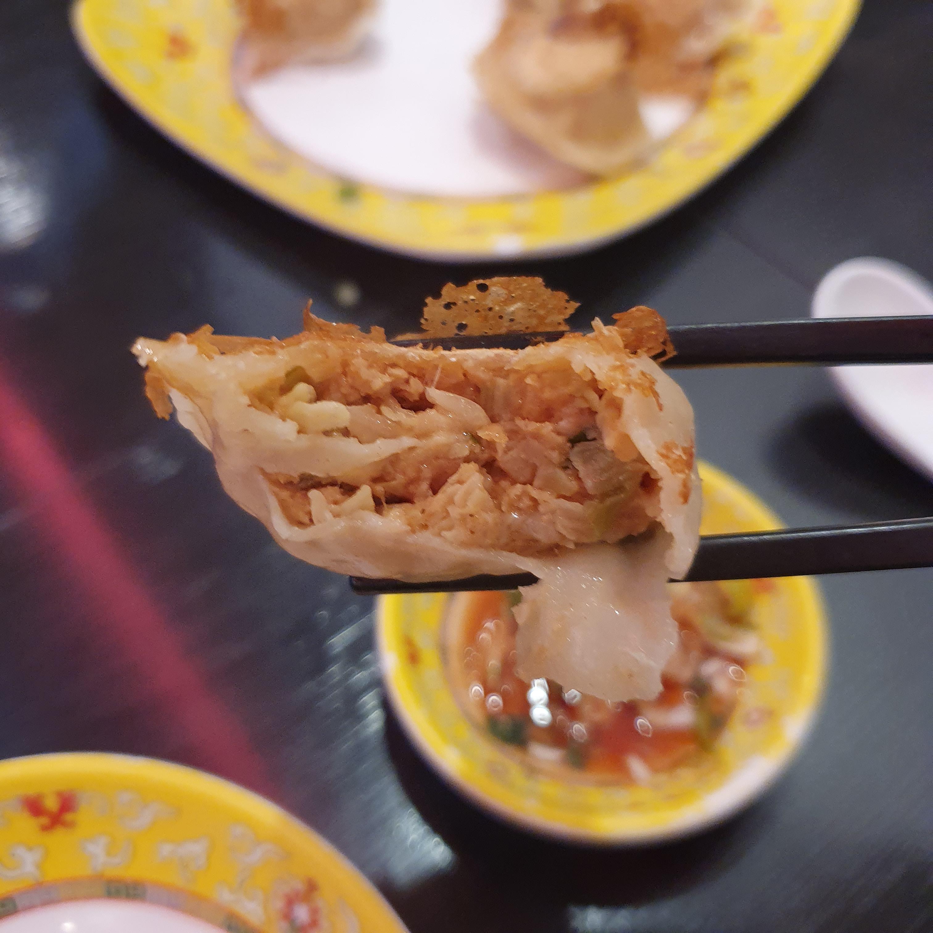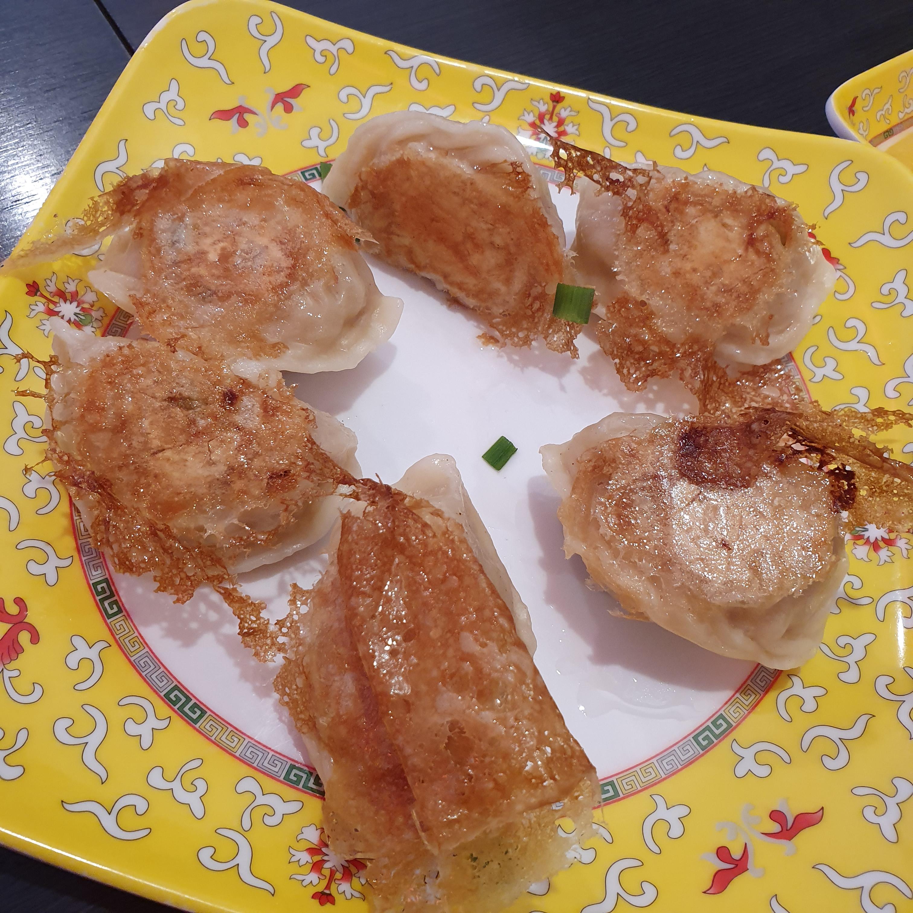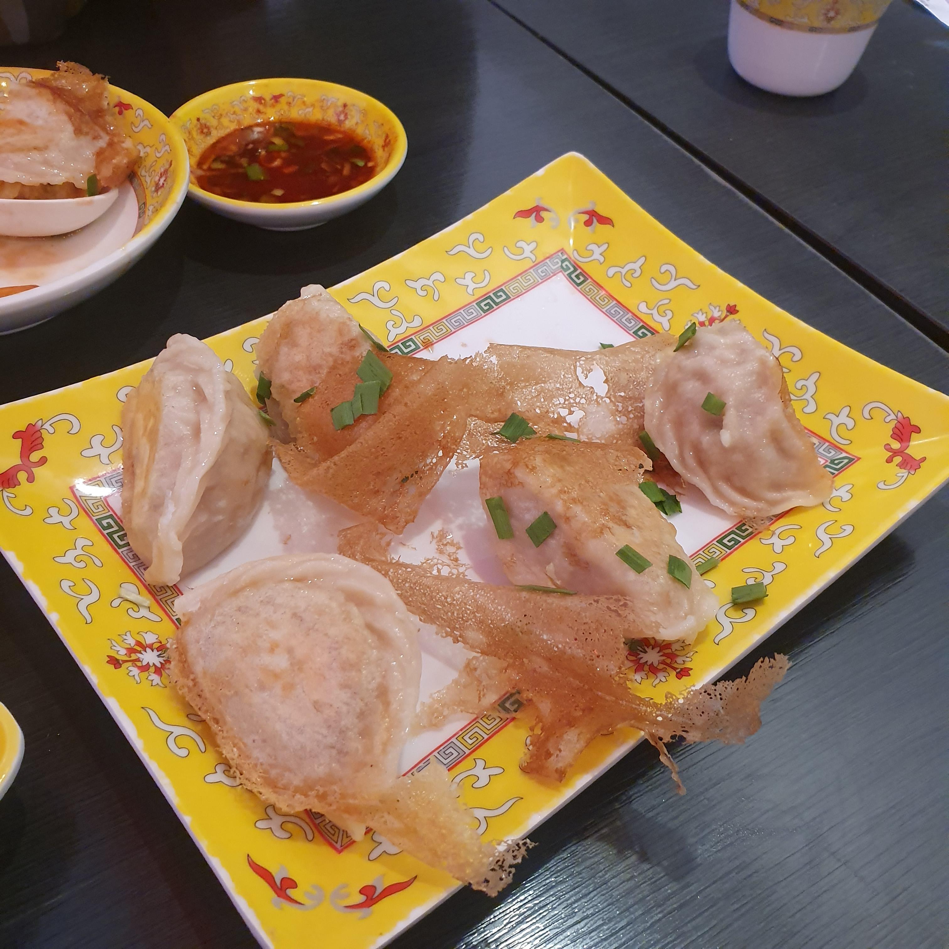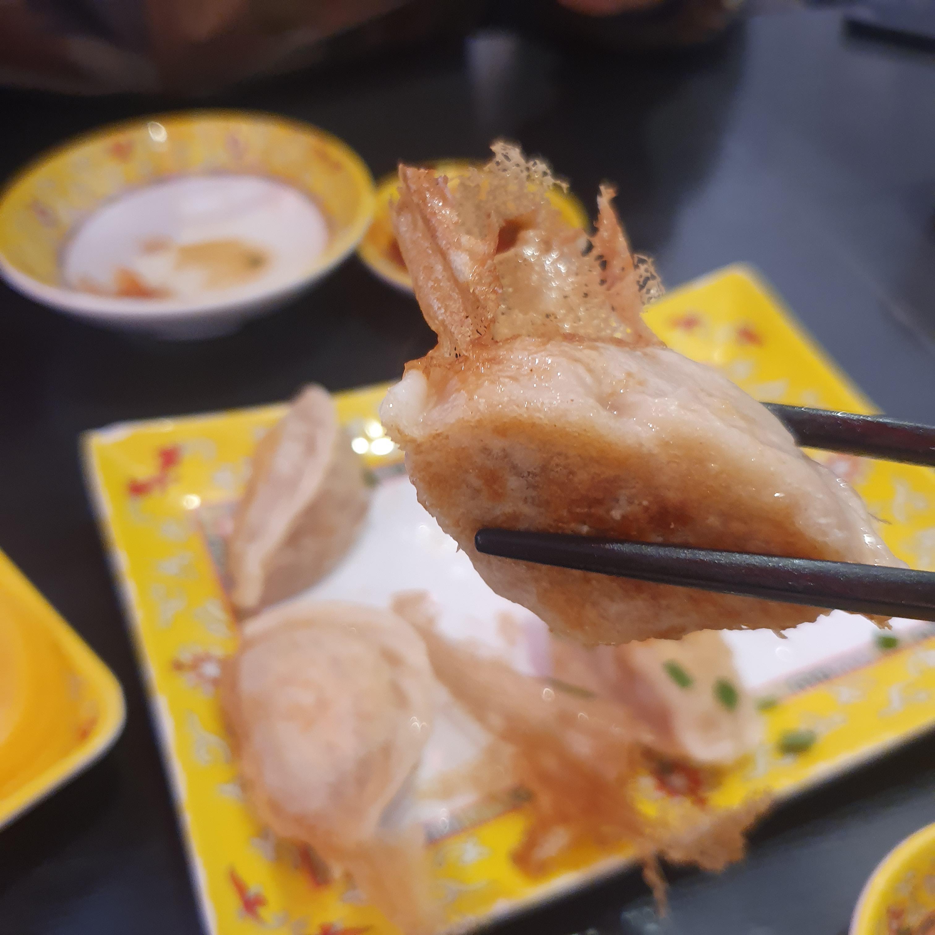 기름이 아닌 빙화수로 튀겨 바닥은 굽고 윗부분은 찐 만두의 식감이 특징이다.