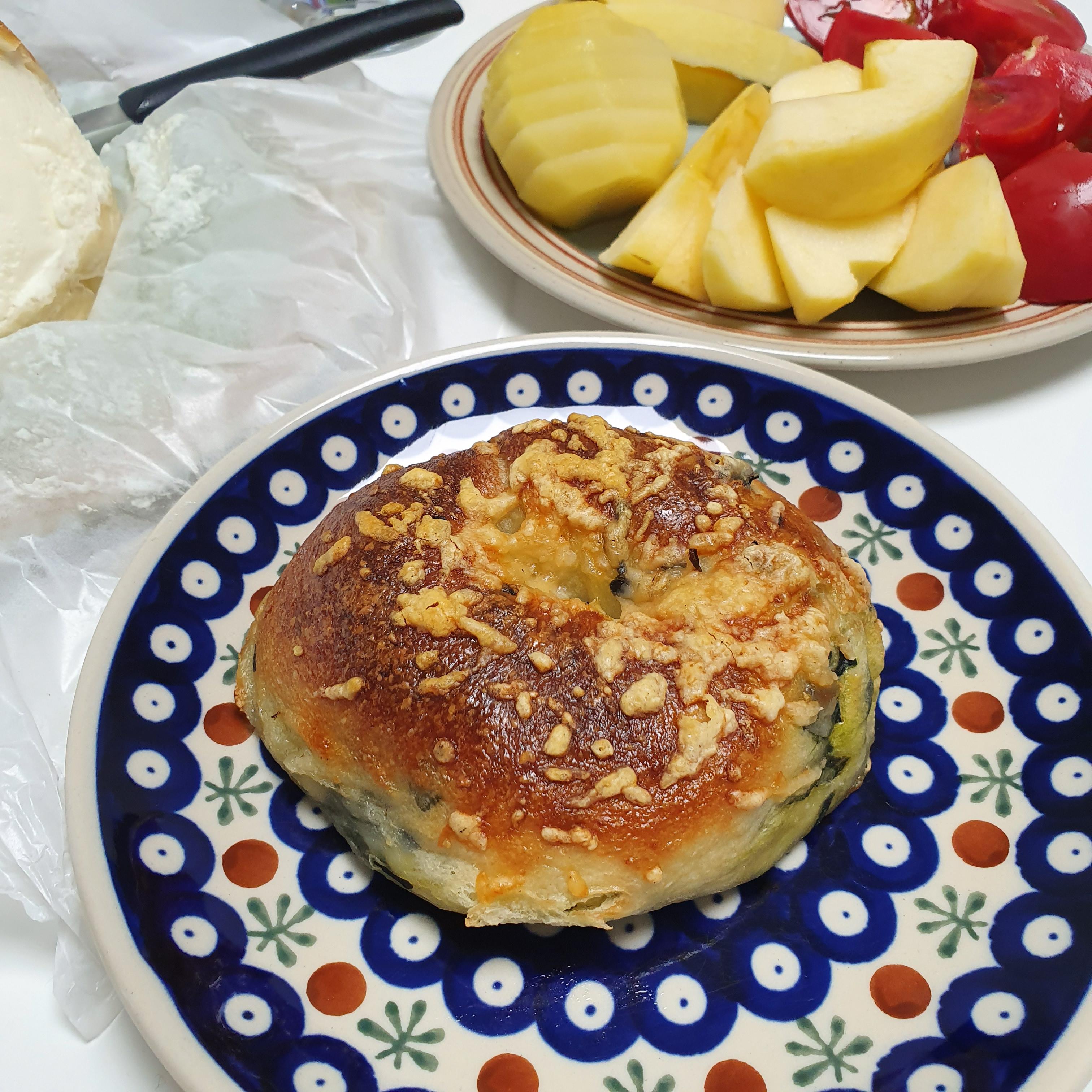 사진에 있는 베이글은 시금치와 크림치즈생크림 베이글이다.