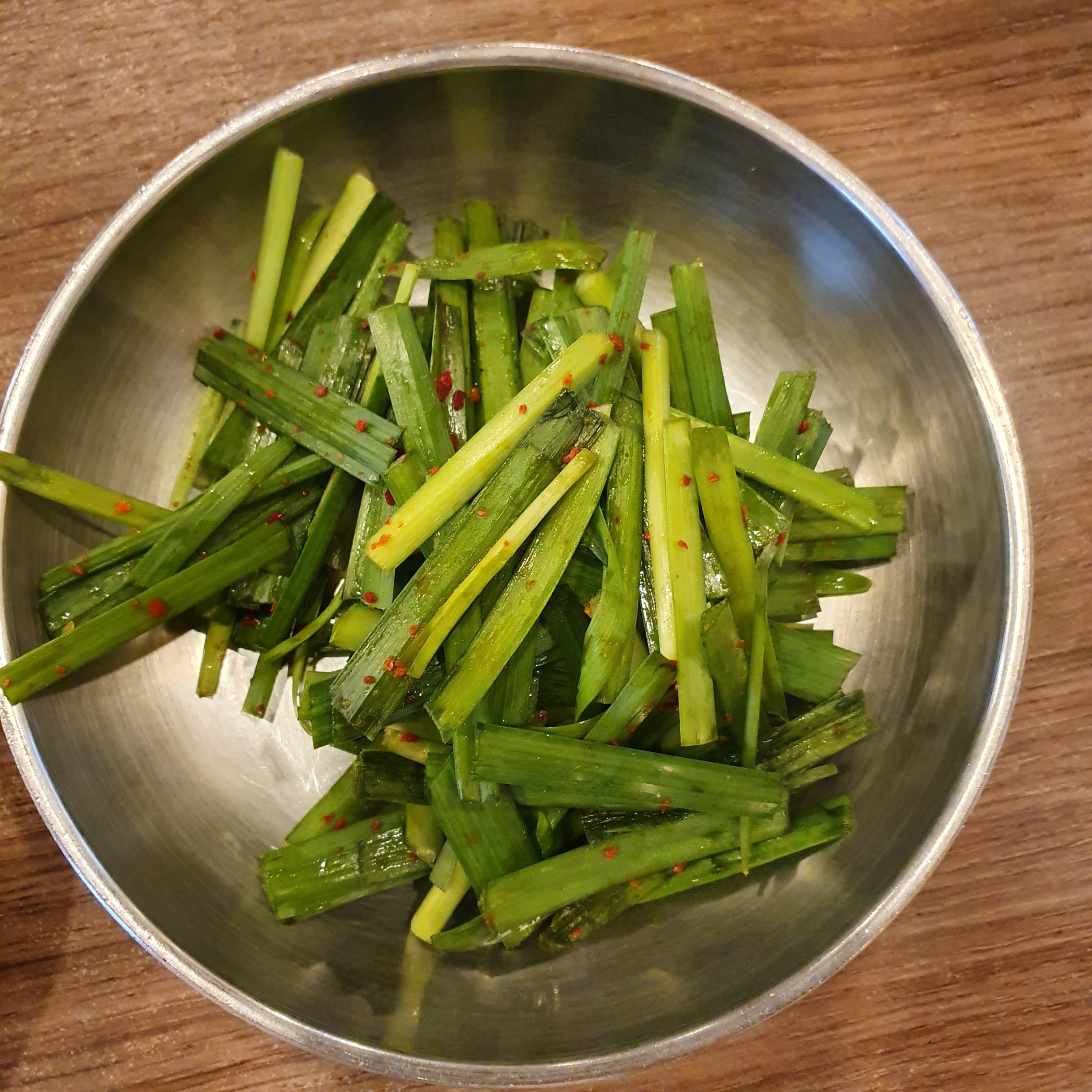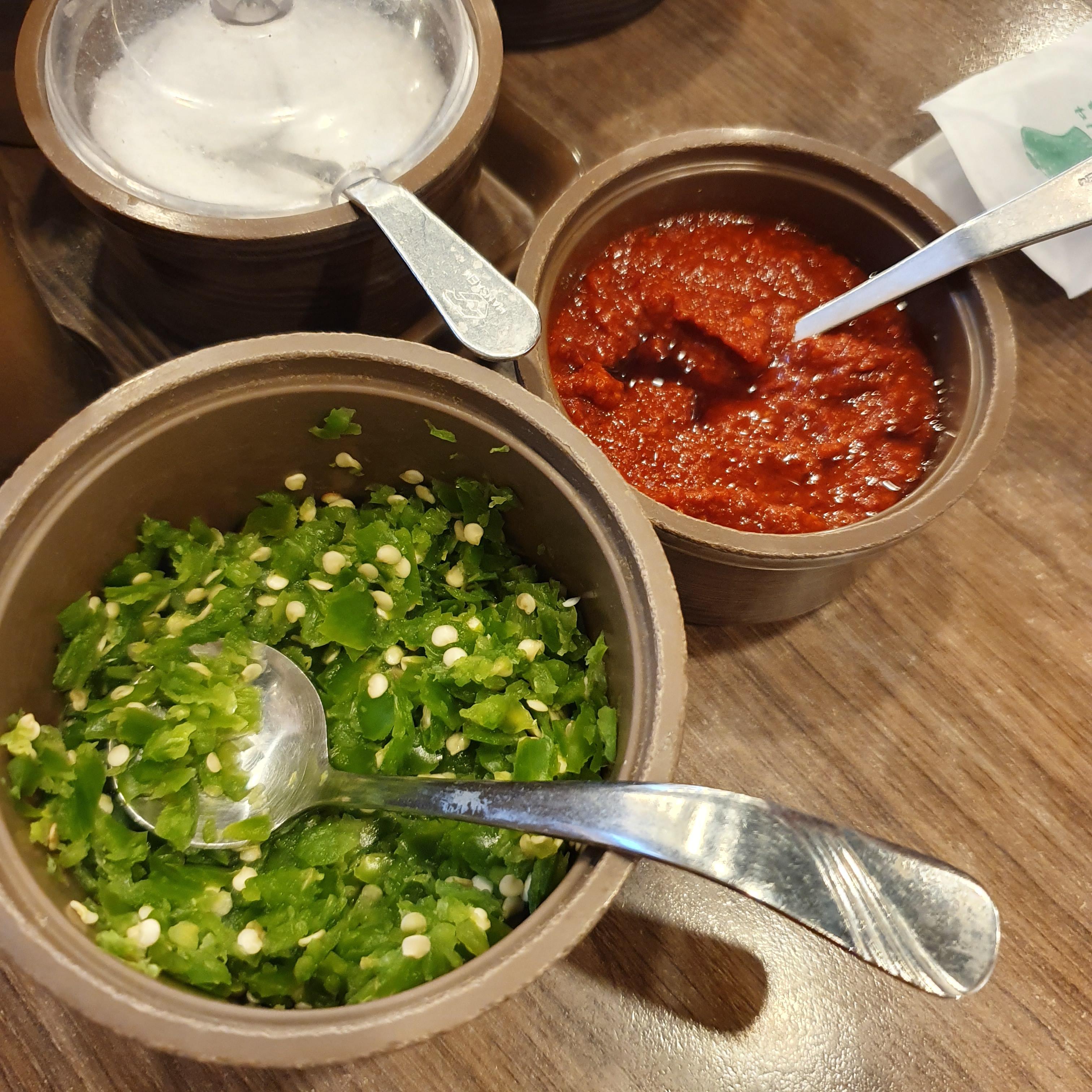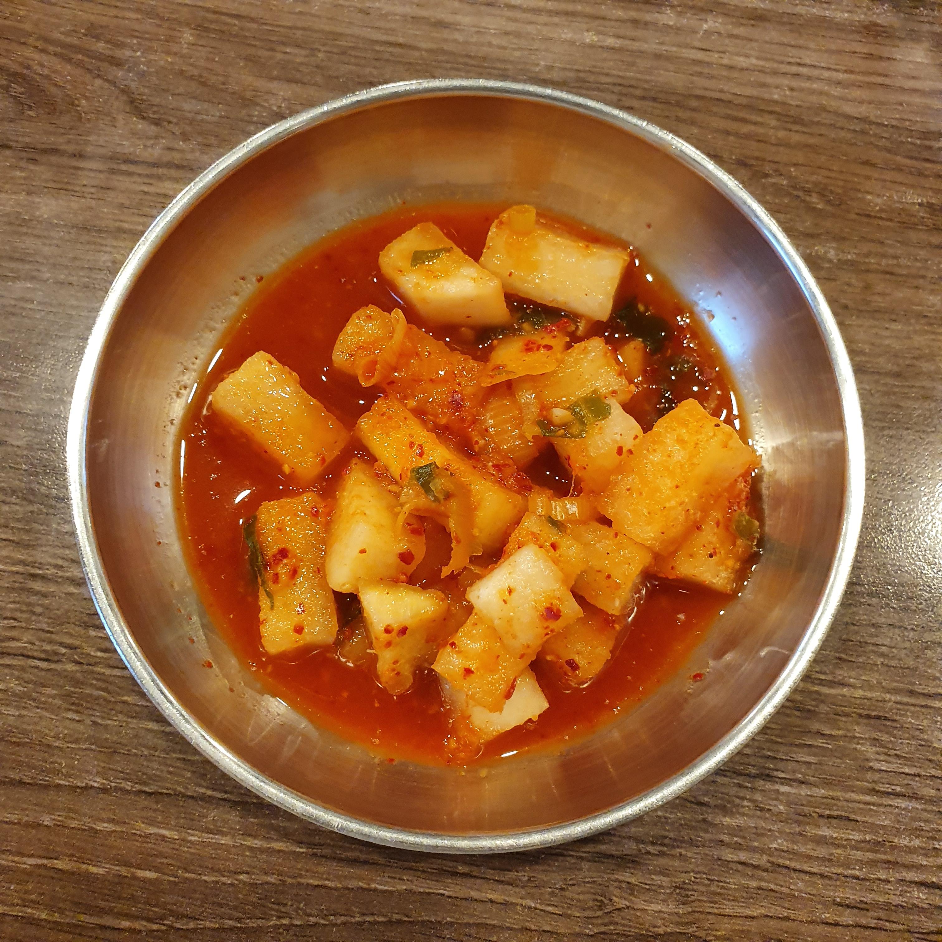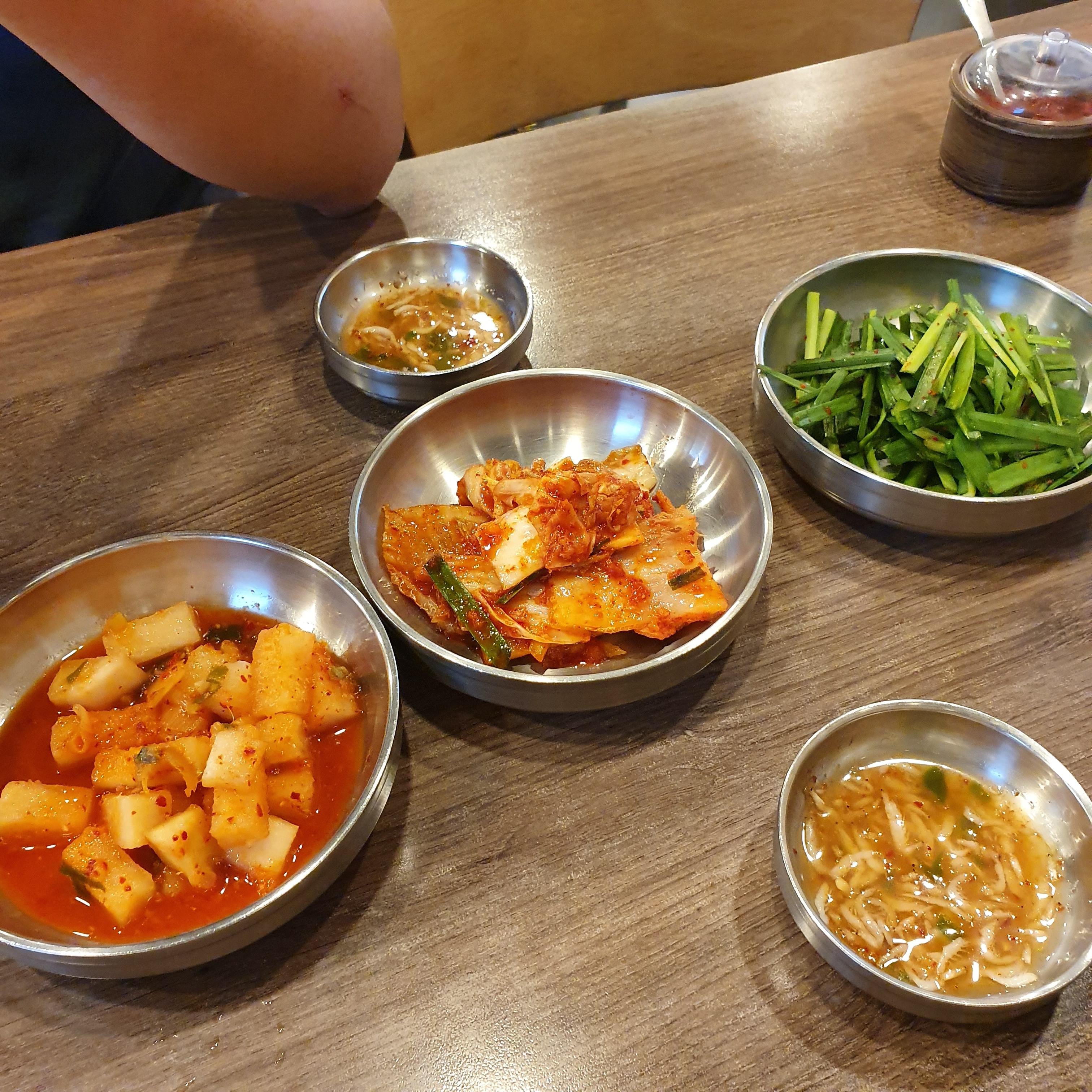 깍두기, 배추김치, 새우젓, 다진청양고추, 매운양념장.
