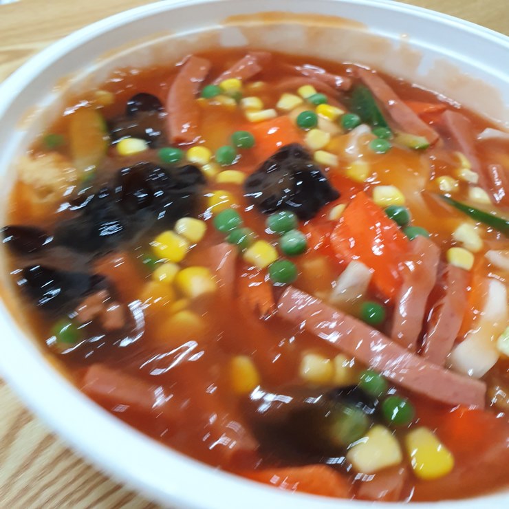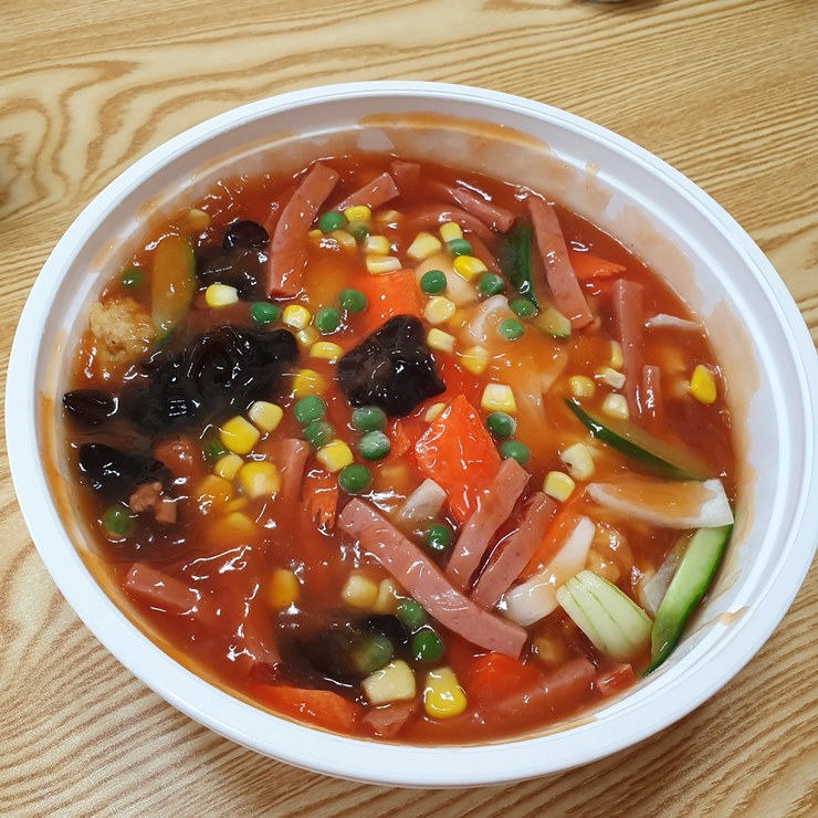목이버섯, 완두콩, 콘옥수수, 양파, 오이, 햄, 당근 등이 들어가 있고