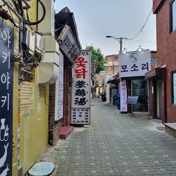 요즘 지도어플이 정말 잘 되어 있어서, 길 찾는 것이 어렵지는 않습니다만 산동만두는 골목에 위치해 있고, 또 마포역과 공덕역 사이에는 무수한 골목이 존재한다는 것. 그 때 장공당 떡군 앞 골목으로 들어가시면 산동만두를 쉽게 찾을 수 있다는 것을 알려드리고자 사진을 찍어 왔지요.