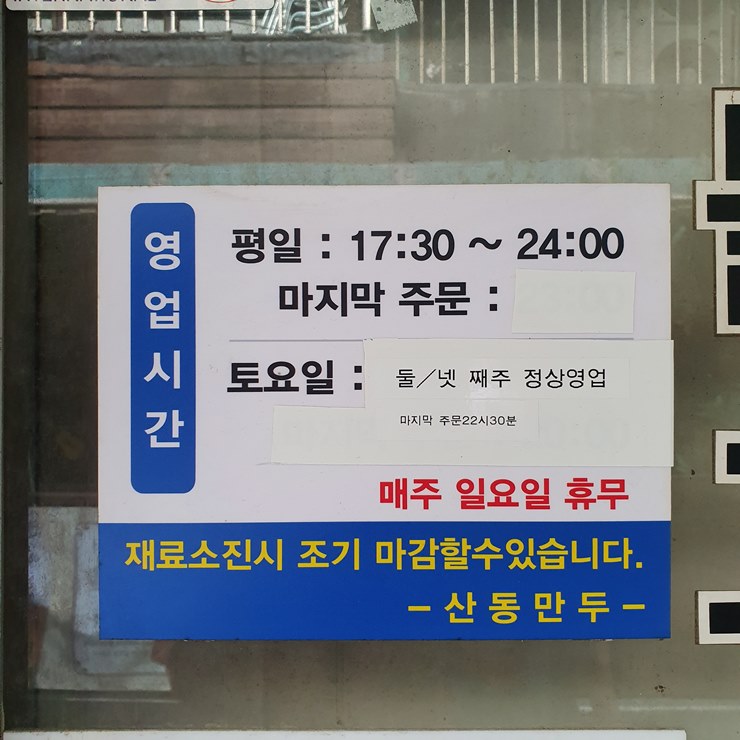 앞에 지도와 설명해드렸던, 산동만두 영업시간은 가게 문 앞에도 부착되어 있습니다.