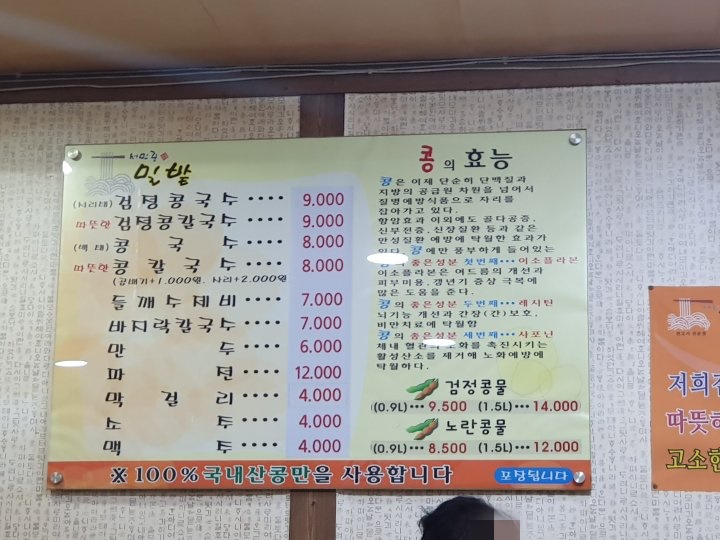 메뉴판 아래에 쓰여져 있는 100% 국내산 콩만 사용한다는 문구는 좋은 식재료를 사용한다는 믿음이 가는 부분입니다.